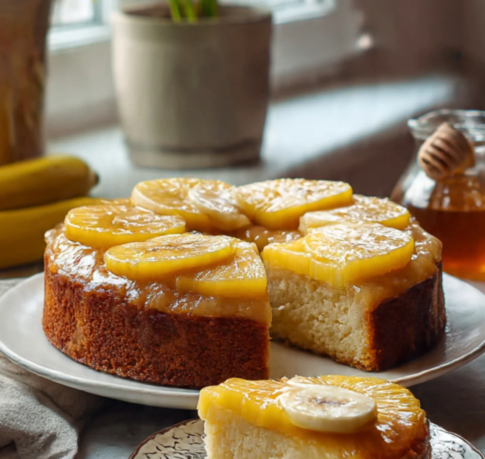 Sweet ripe banana meets juicy crisp pineapple meets a honey butter cake drizzled with of course…. Honey!