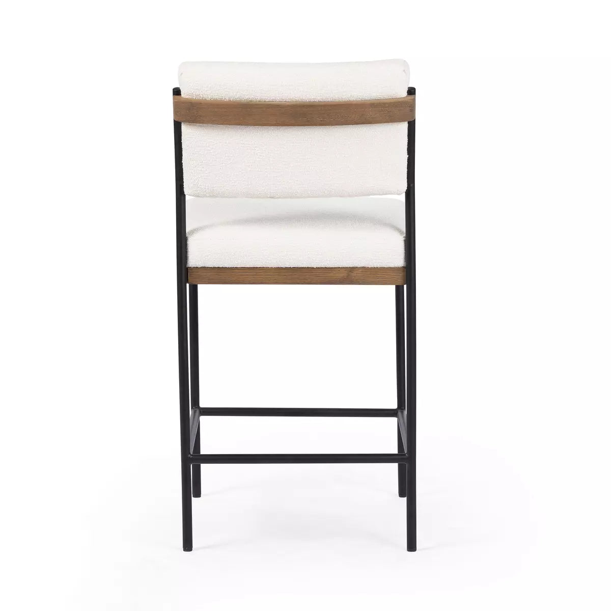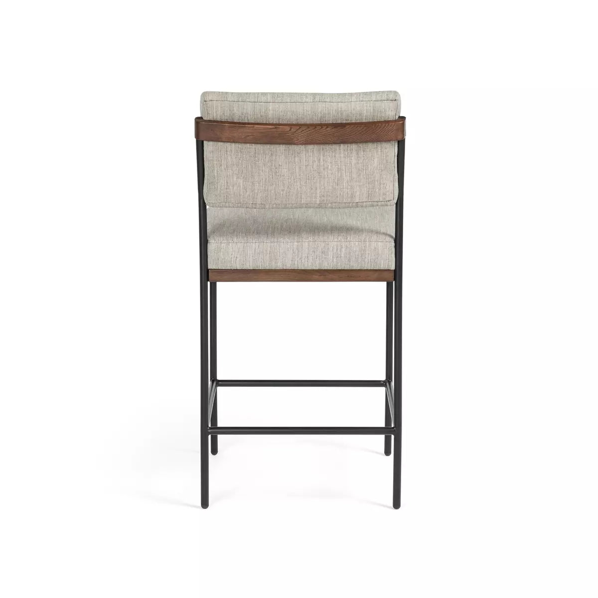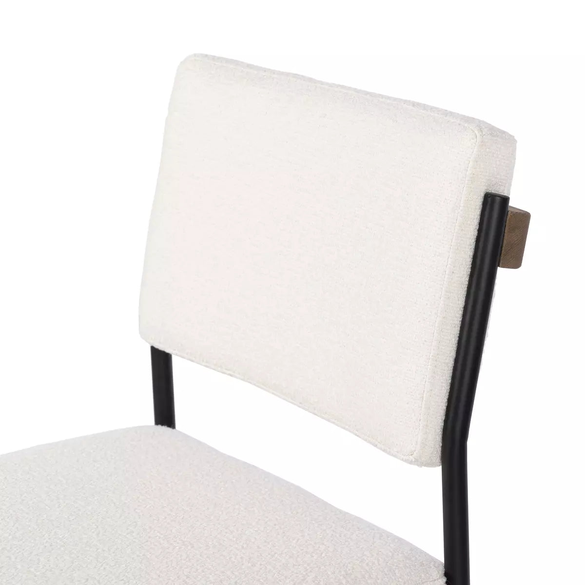 Simple and streamlined with fresh, thoughtful details. Slim, black-finished round stock iron suspends an almond-finished nettlewood deck, with a flannel-colored linen-blend seat and floating back with a rear wooden stretcher.