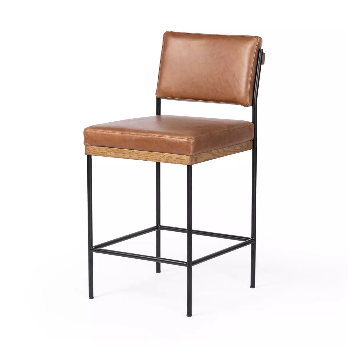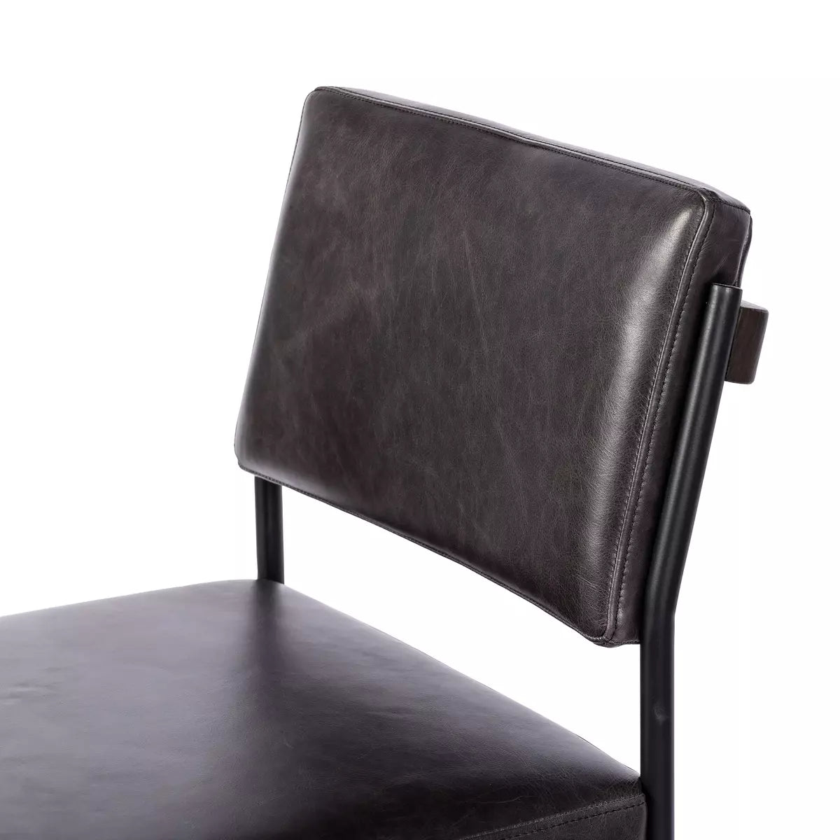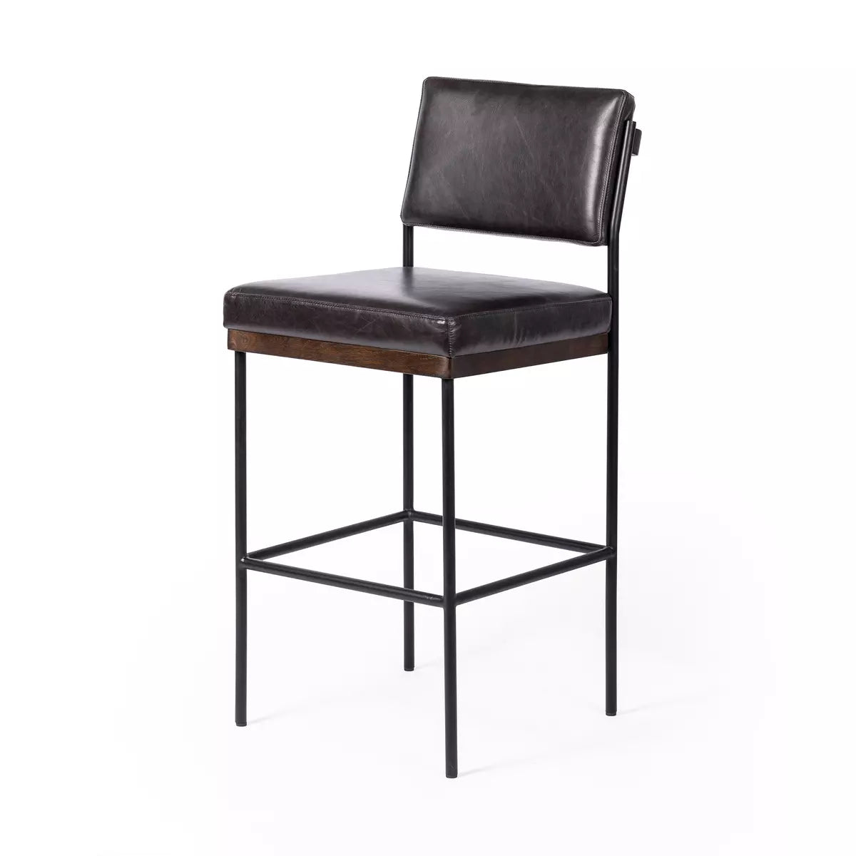 Simple and streamlined with fresh, thoughtful details. Slim, black-finished round stock iron suspends an almond-finished nettlewood deck, with a flannel-colored linen-blend seat and floating back with a rear wooden stretcher.