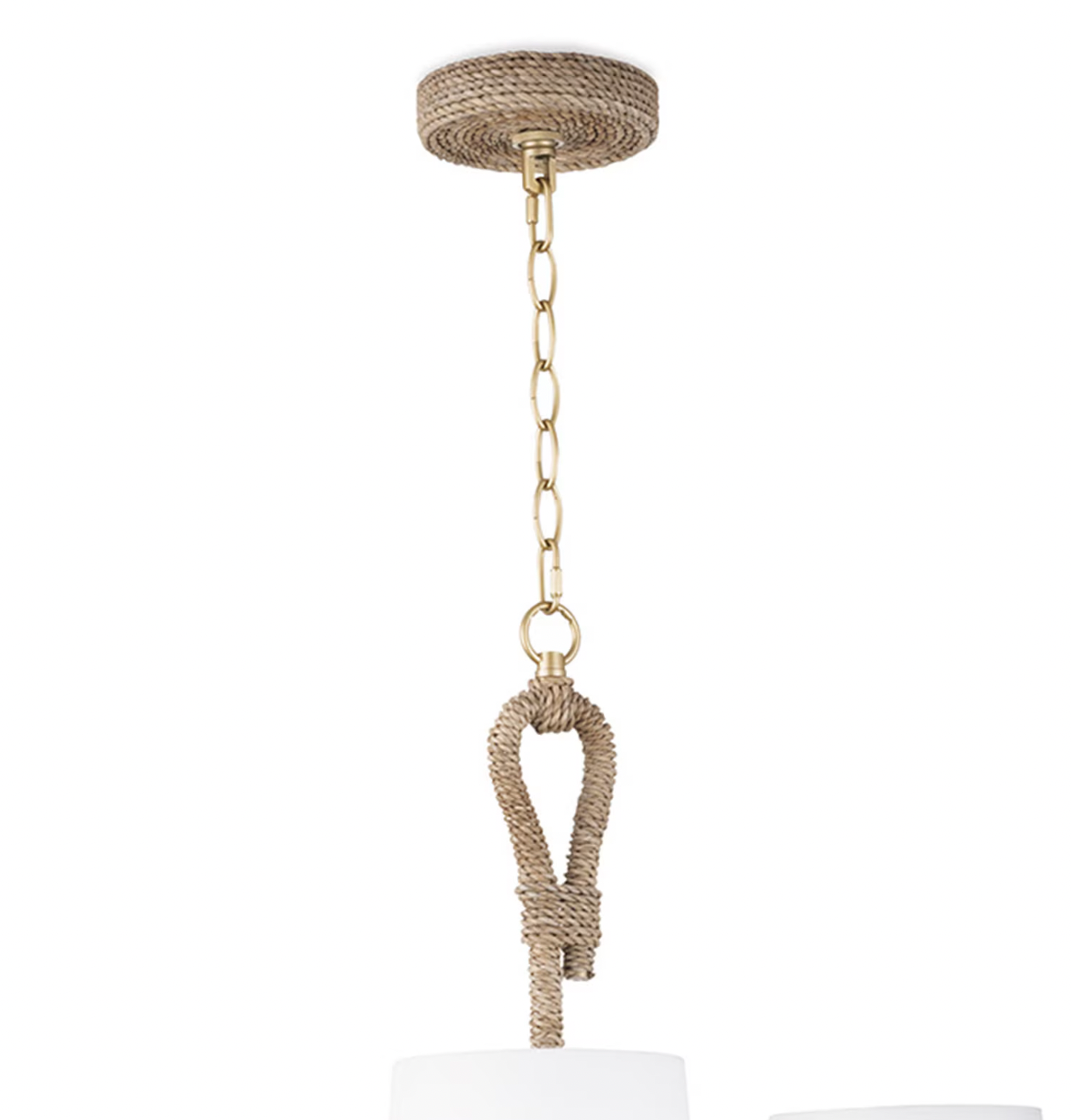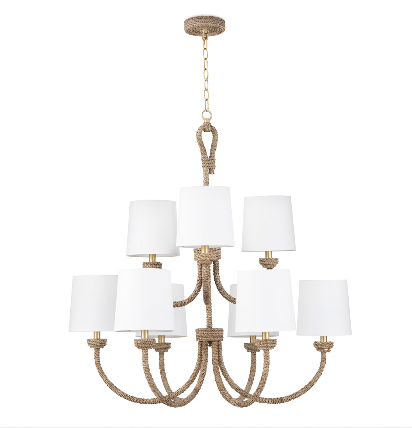 Natural woven seagrass provides a "washed ashore" look on the Bimini large chandelier. Looped detailing provides a nautical touch, while nine natural linen shades tailor the look. Install above a dining room table in a coastal or rustic kitchen to tie its design together.