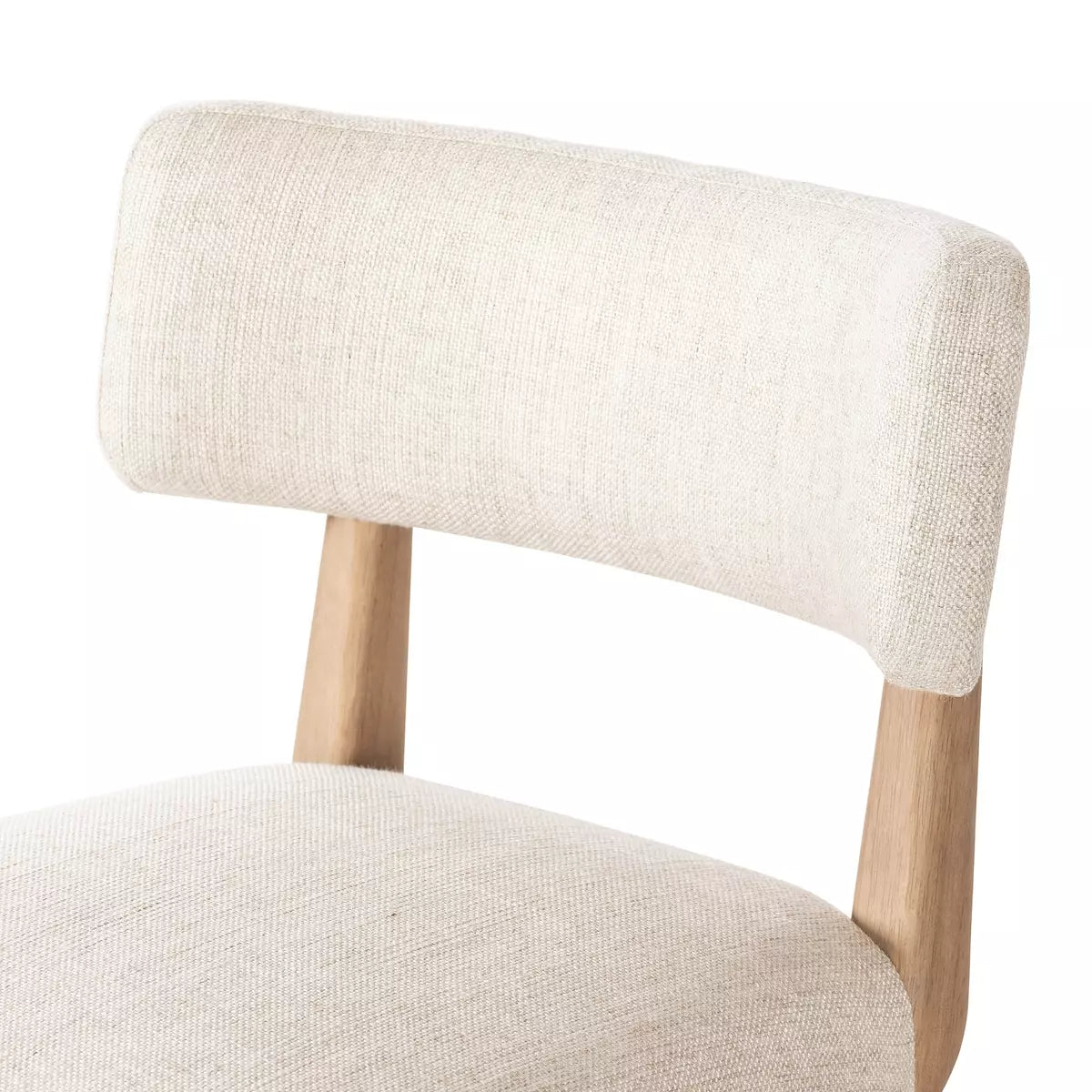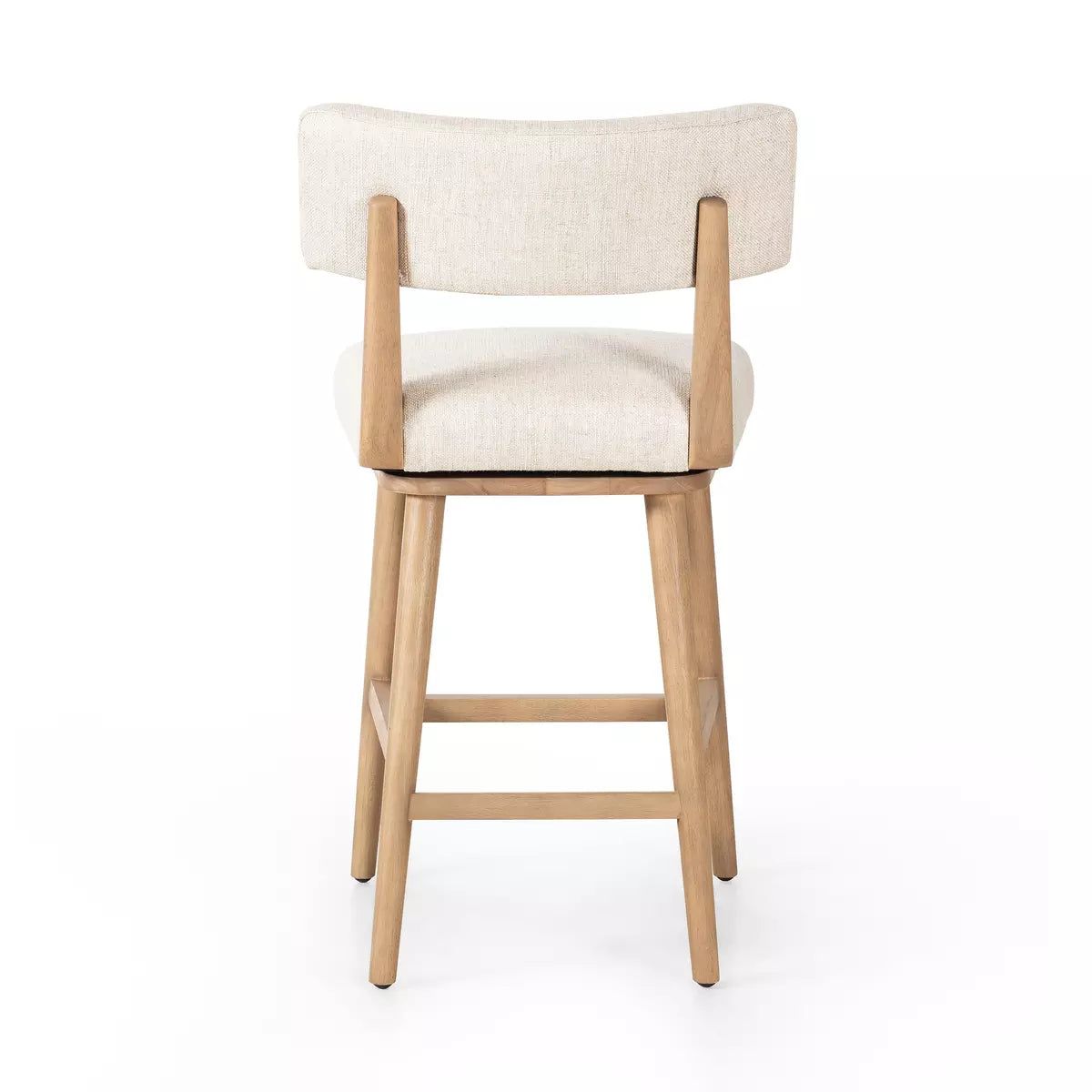 Natural solid parawood forms a curved barrel back on this everyday dining stool featuring a memory swivel. Plush cushioned seat and back are upholstered in a textural woven fabric.