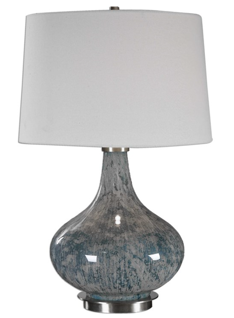Mottled, light blue gray glass accented with plated brushed brass details. The slightly tapered round hardback shade is an ivory linen fabric with light slubbing.