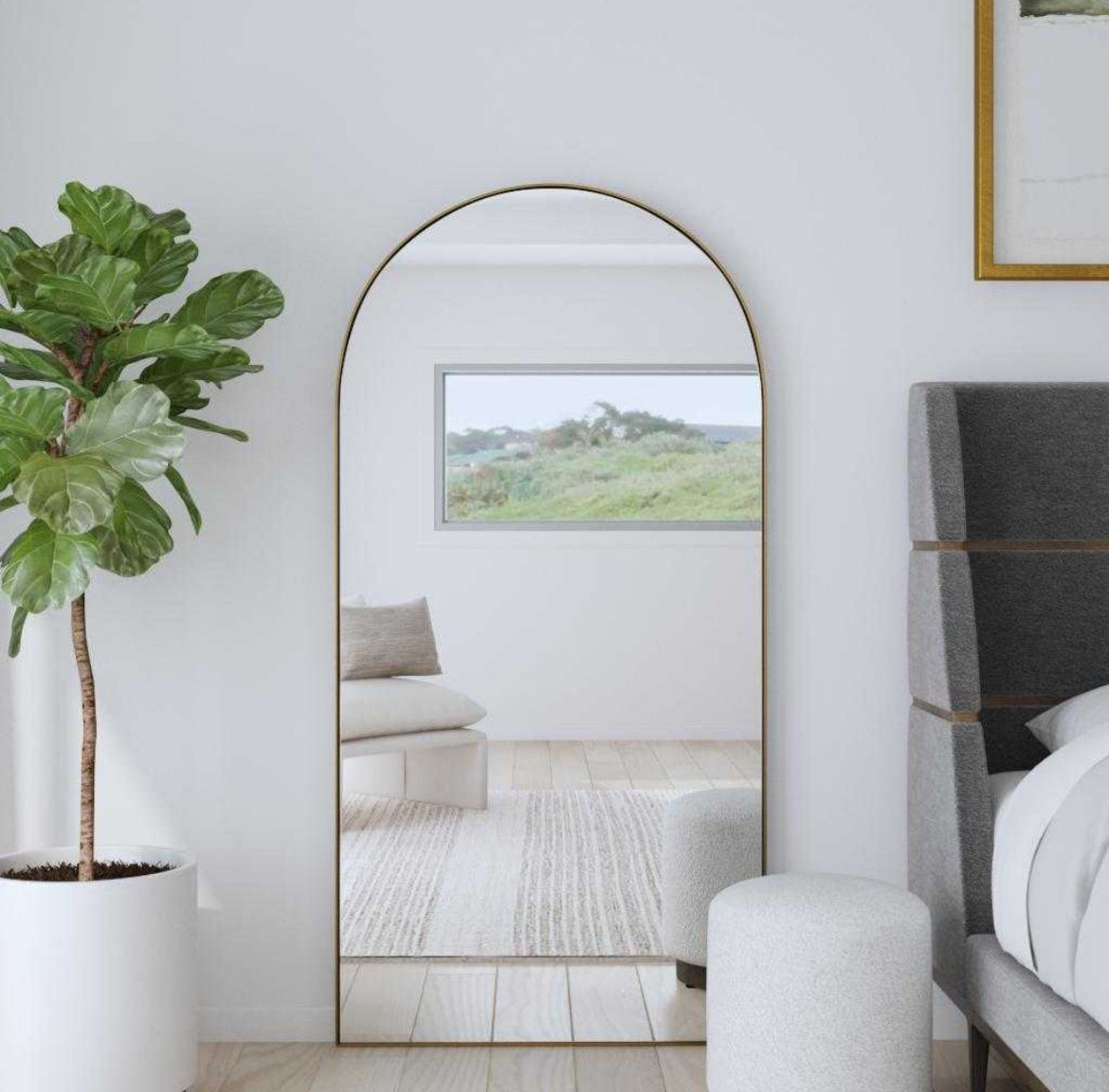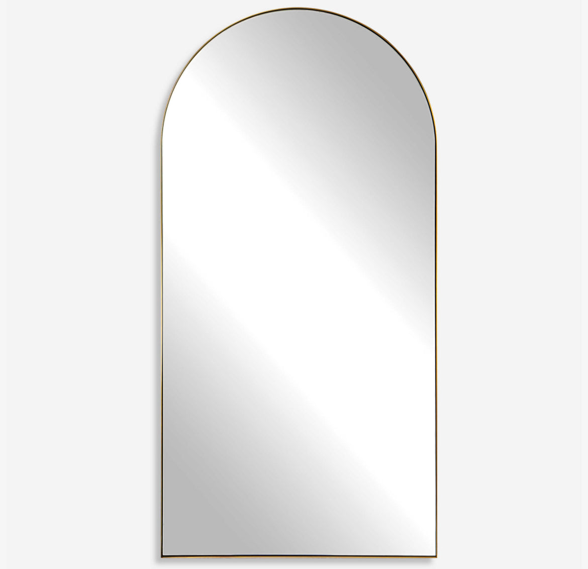 This oversized arch features a sleek stainless steel frame finished in a rich antique brass surrounding a floating, polished edged mirror.