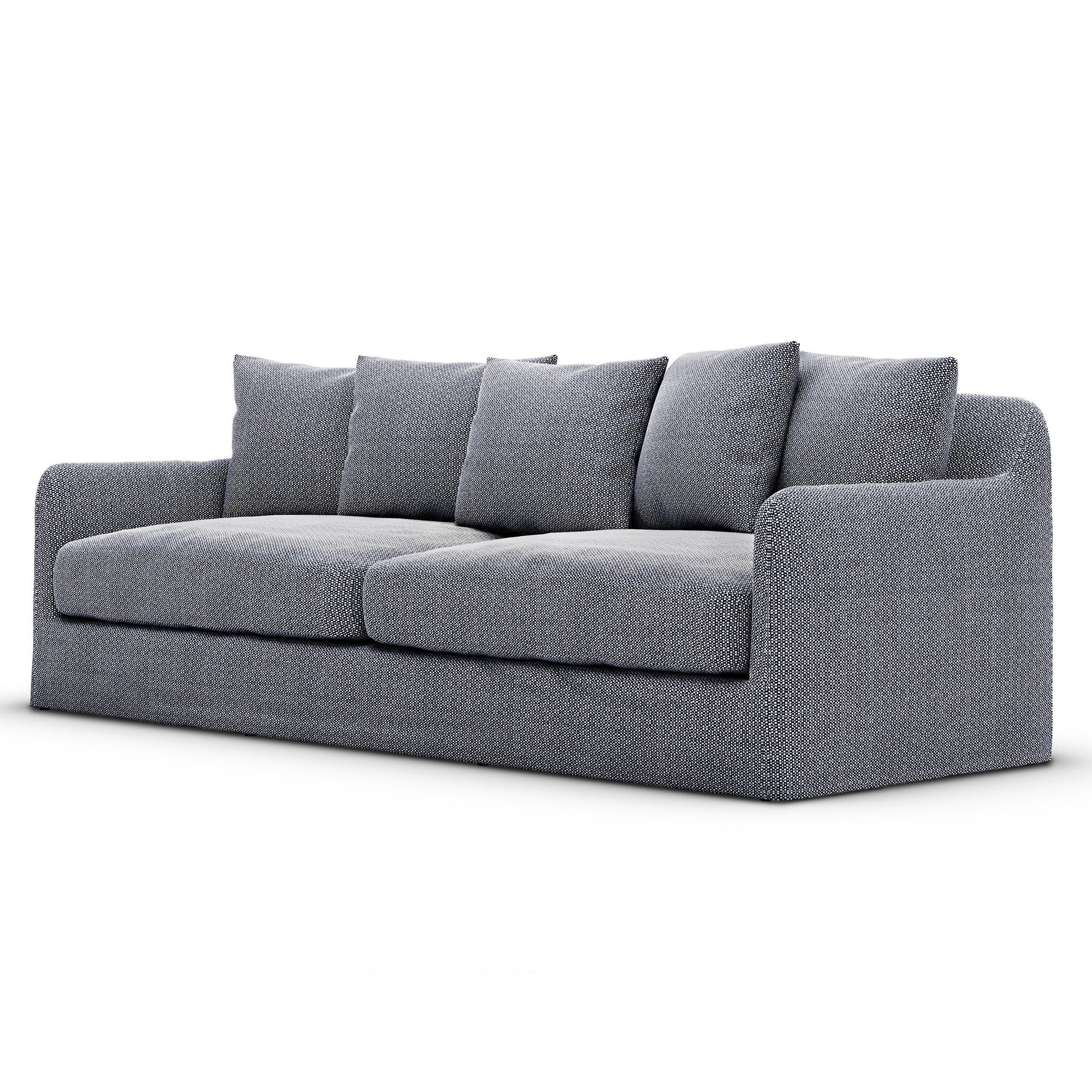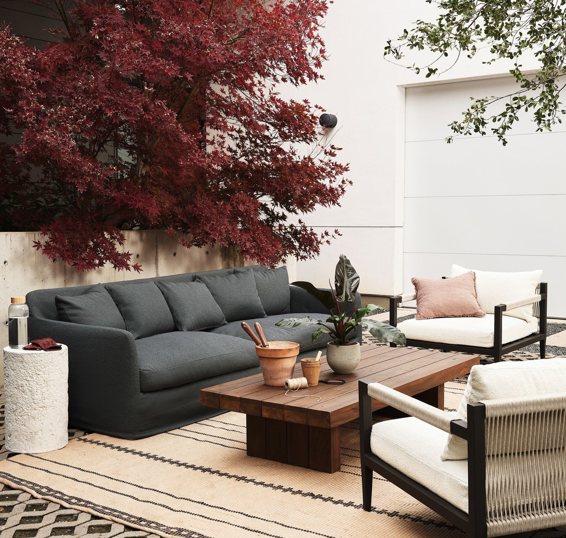 A fresh, coastal take on outdoor lounging, a soft slipcover spurs style and sensibility alike. Easy to clean and made from fully recyclable materials, Fiqa fabrics are machine-washable, stain-resistant, water-repellent and antimicrobial. Cover or store indoors during inclement weather and when not in use.