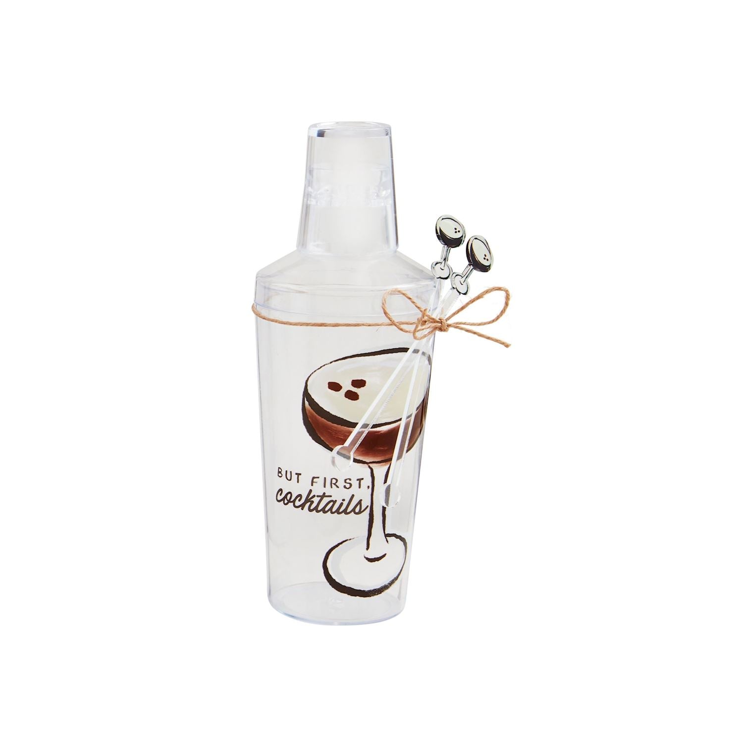 Acrylic cocktail shaker comes with acrylic shot glass and two icon topped acrylic stirrers.
