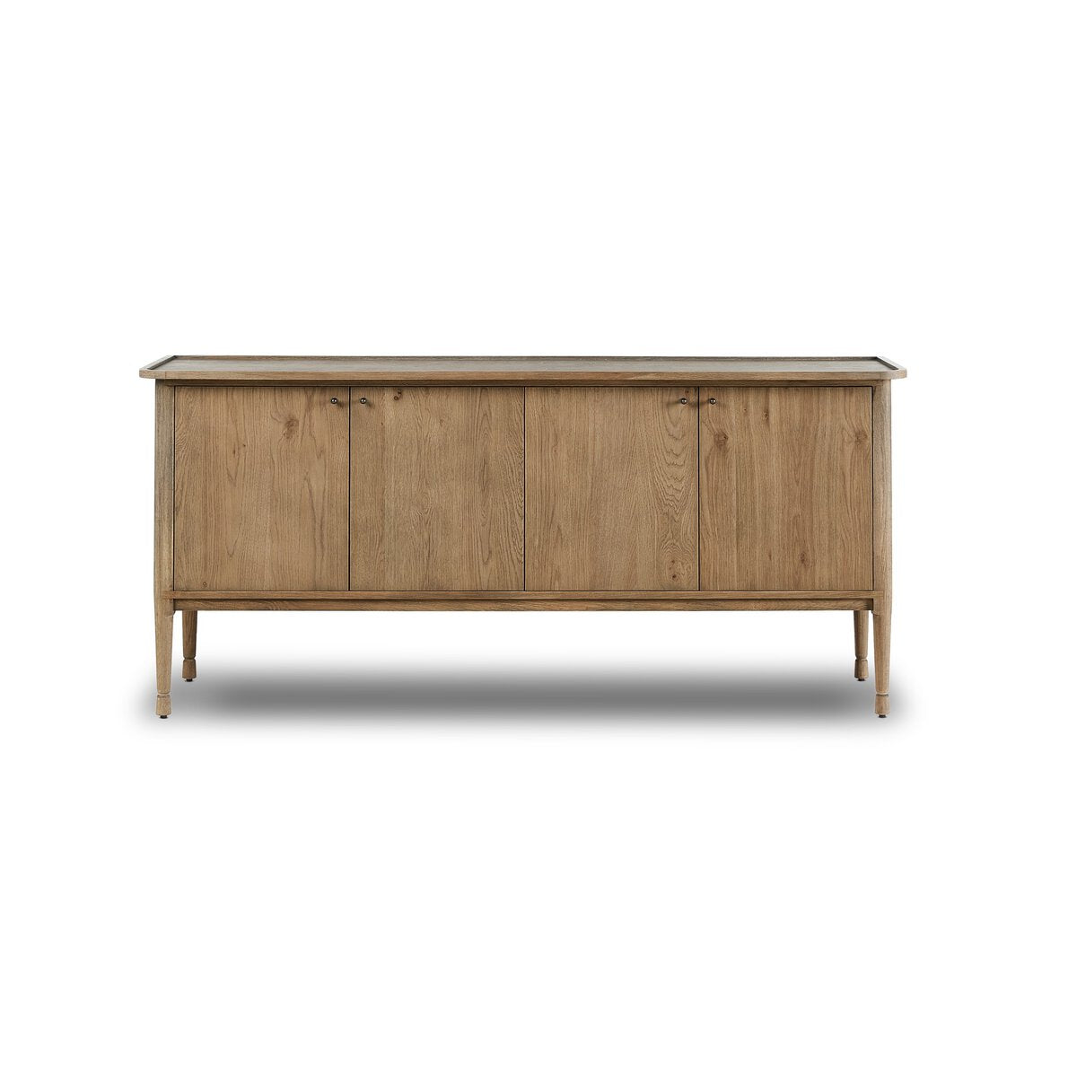Heritage-inspired style meets modern design in this sand-finished oak sideboard, featuring tapered legs with uniquely shaped bottoms. The overhang top with a distinctive lip edge adds an intentional detail, while simple hardware complements the leg design. Rear cutouts for cord management.