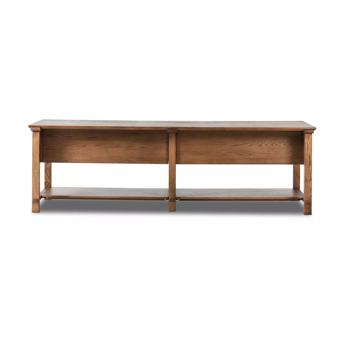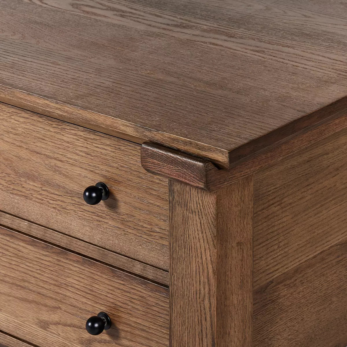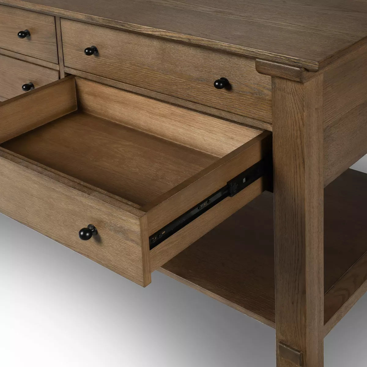 Make room for more prepping, gathering and storage. This large and functional kitchen island features eight wide drawers on one side, a large bottom shelf below and room for stools. Designed with an oak cradle frame that holds the tabletop above with exposed joint details on the shelf and legs below for a benchmade look and feel. Crafted from oak with iron accents.