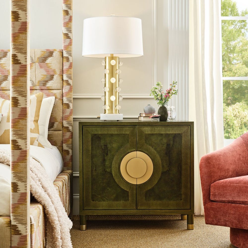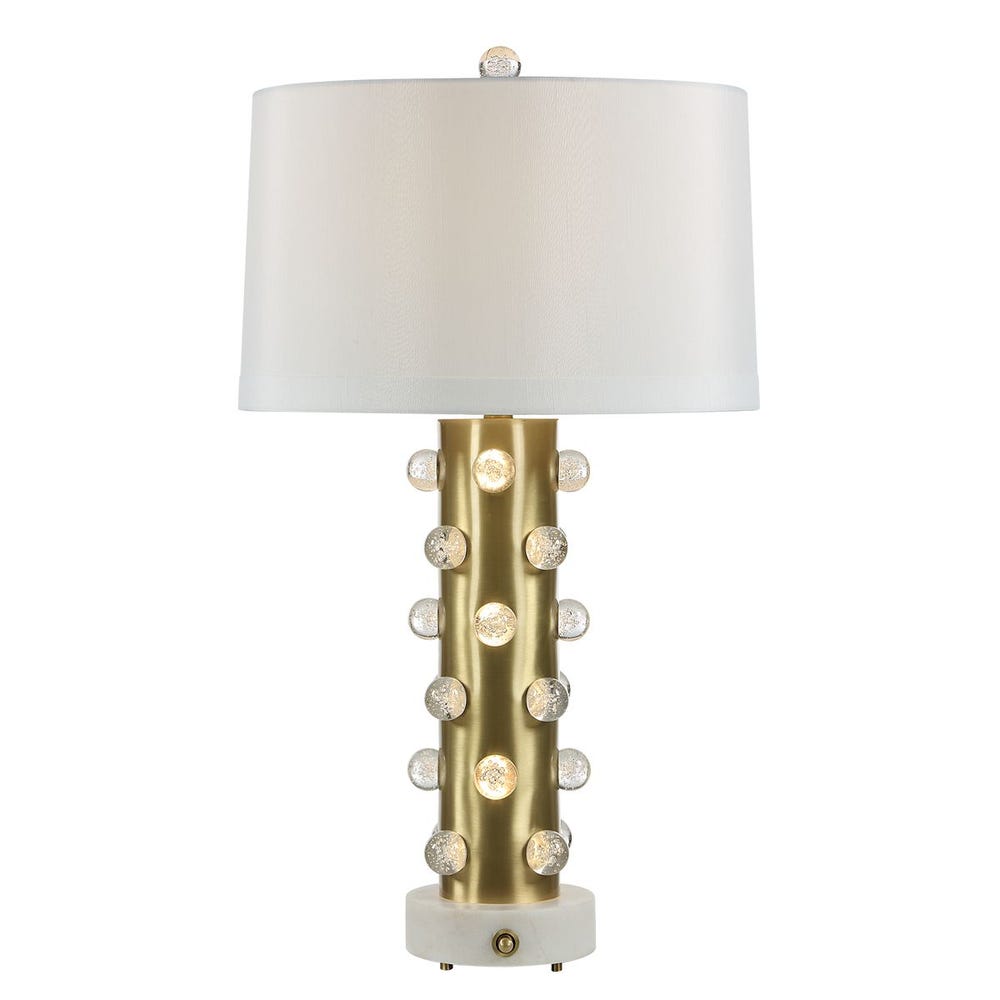 Light cleverly emits through clear crystal bubbles along the cylindrical body in a bright brass finish. Control the body's light volume with a dimmer located on the white marble base (as well as a 3-way switch within the shade). Round tapered hardback white shade in faux silk features a 1.25" trim and is completed with a clear crystal finial on top.