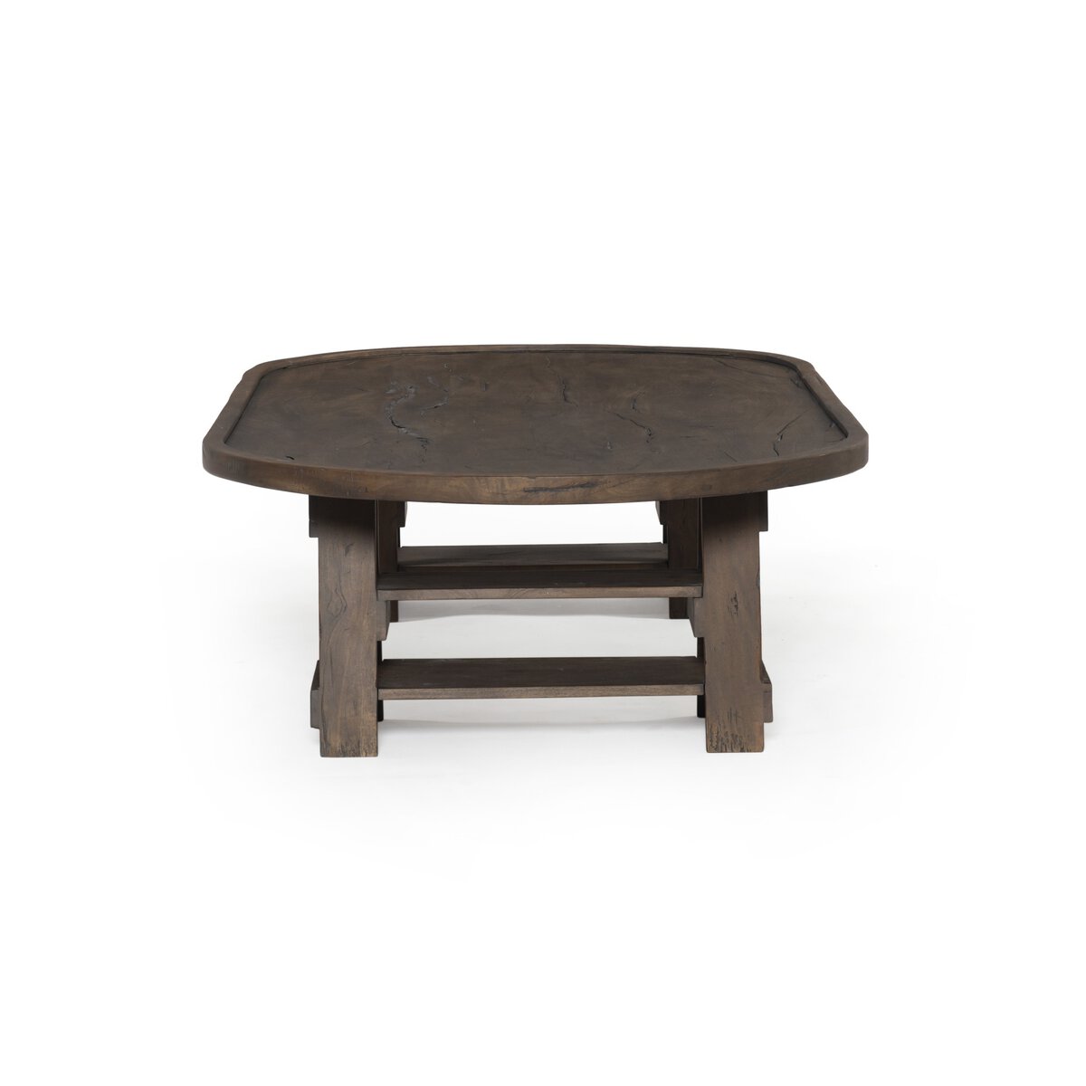 Inspired by traditional sawhorse framing, a grandly sized coffee table made from rich reclaimed woods features tray-style detailing and an artisan feel. Trestle-style shelving adds bonus space for storage and display.