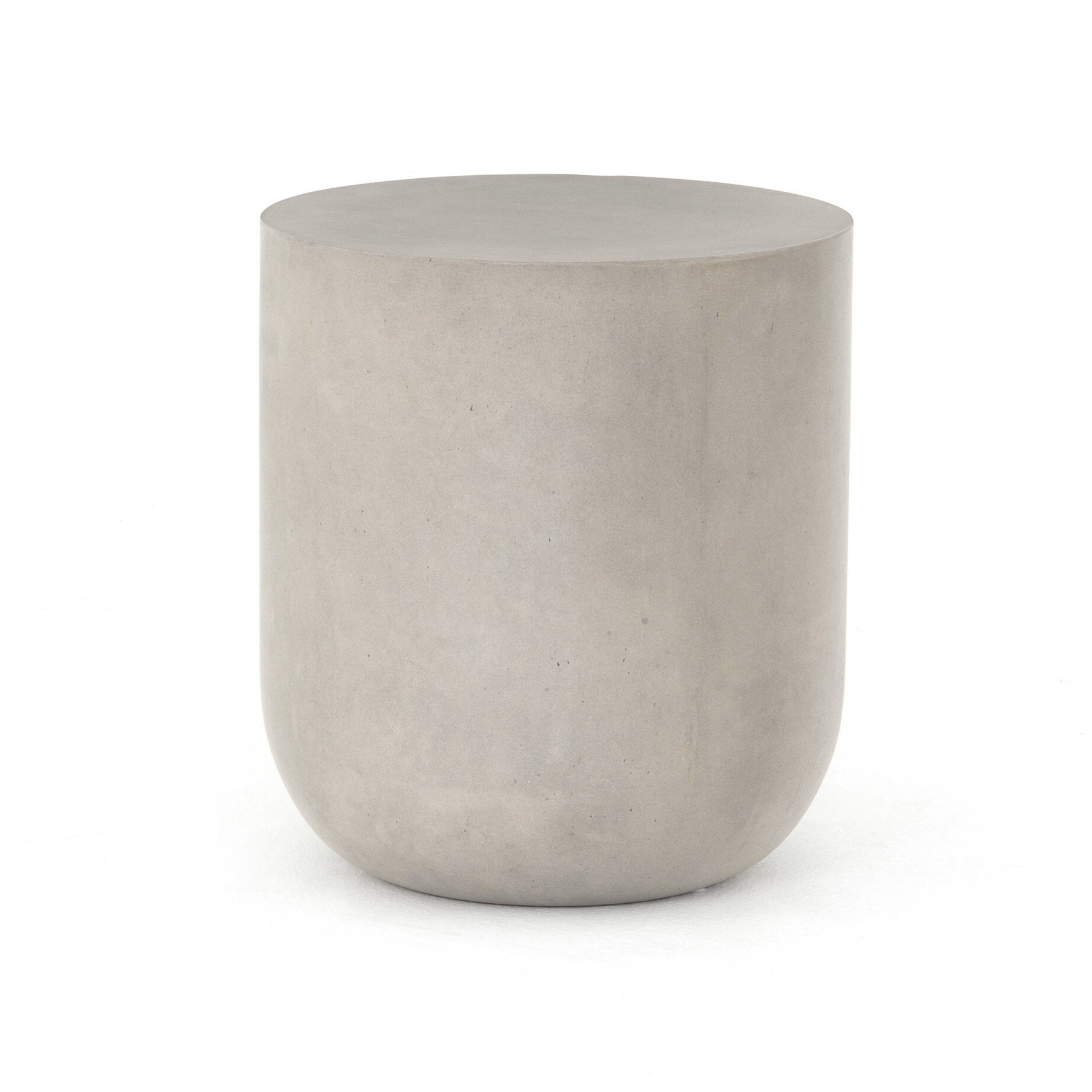Grey-finished concrete and classic drum shaping make for an effortlessly cool end table, indoors or out. Cover or store inside during inclement weather and when not in use.