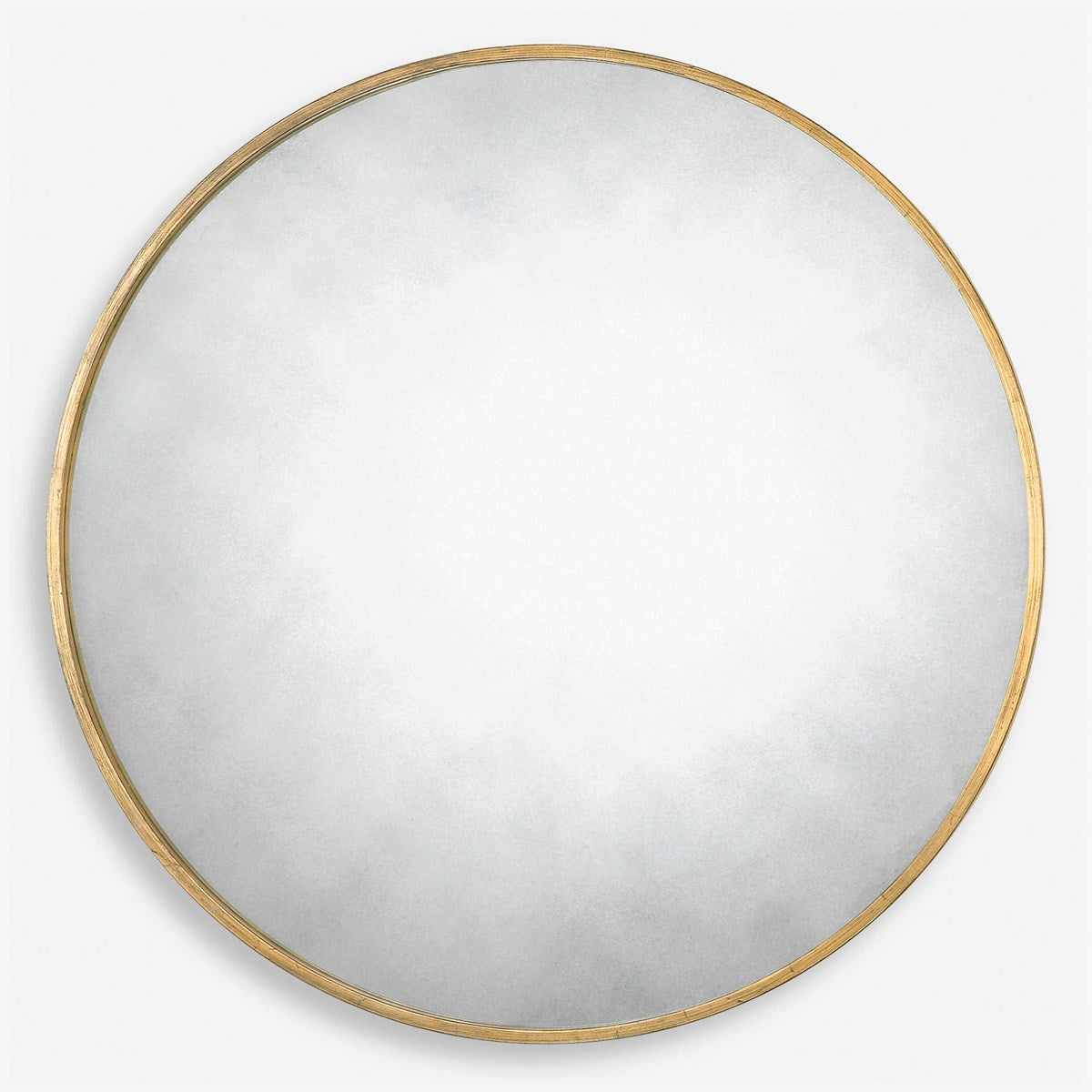 Narrow metal frame with a heavily antiqued gold leaf finish surrounds the antique style mirror.