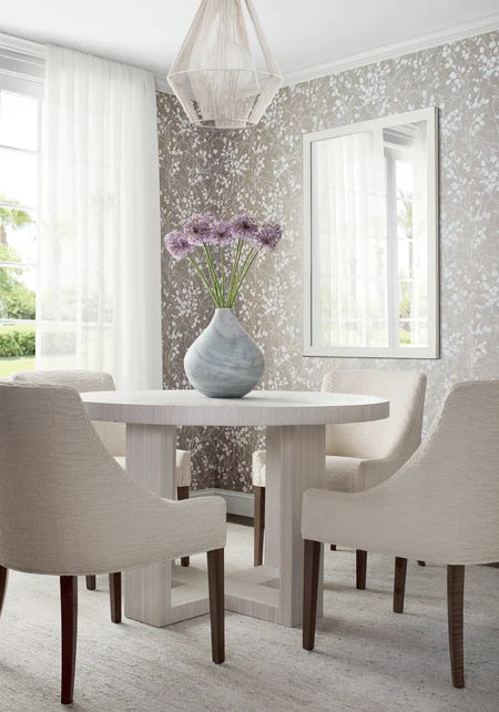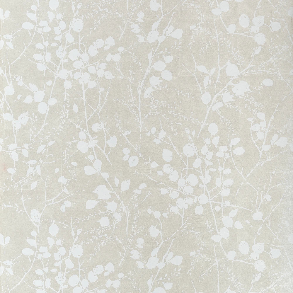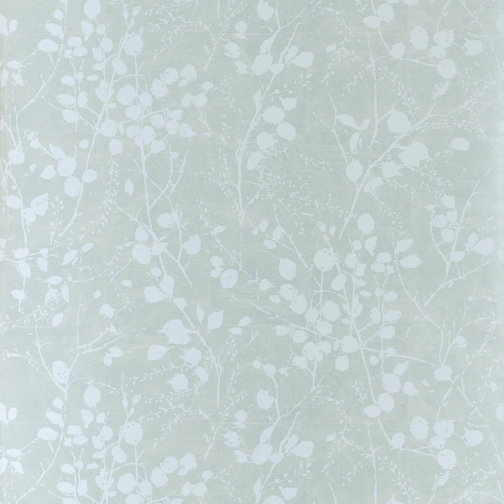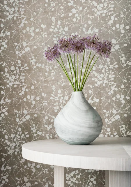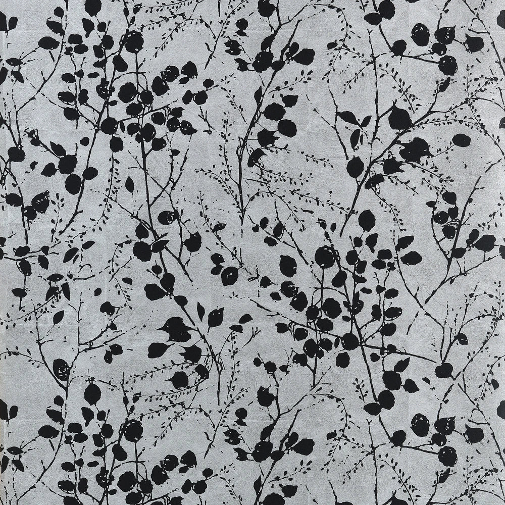 Modern silhouetted buds and wispy leaves adorn a faux metal leaf ground of hand-laid squares. Offered in five luminous metallic colorways, the design balances elegance with performance—pearlescent in finish yet scrubbable, strippable, and durable.