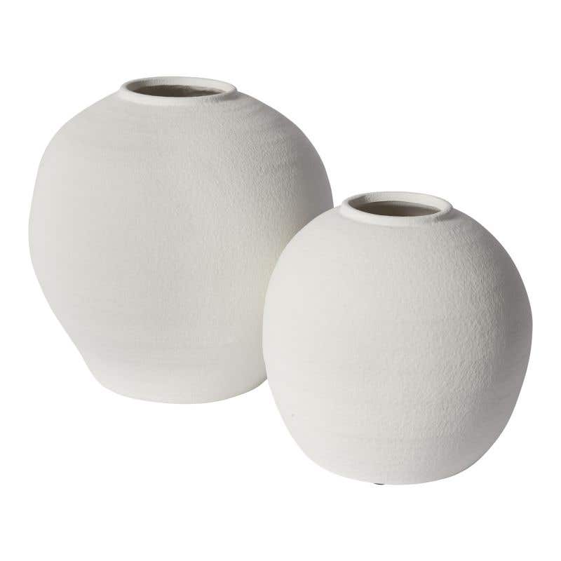 The Konos Vase is a round bellied cement vase in bright textural white. Its size and shape provide a perfect canvas for a large statement arrangement or a simple tropical stem.