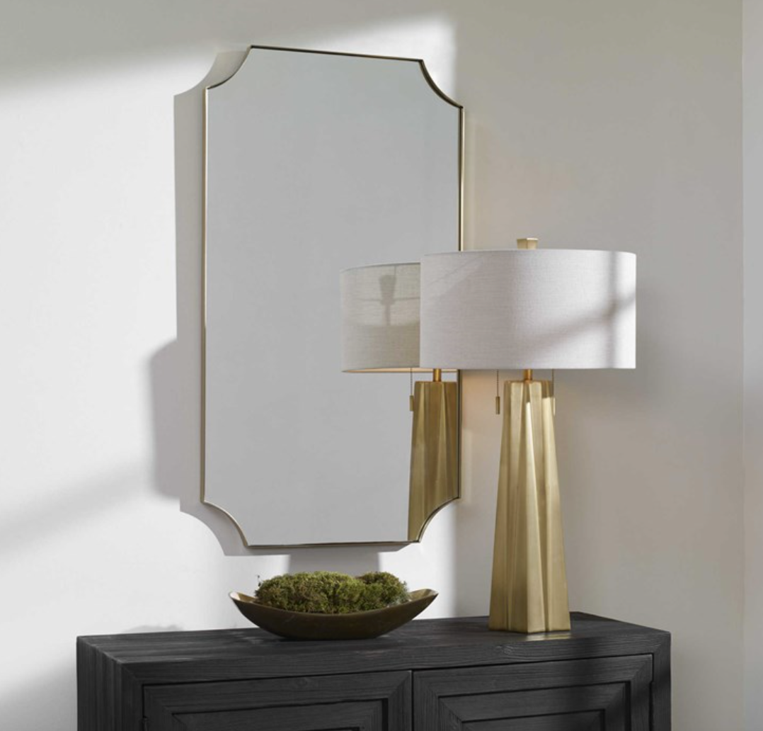 A stylish take on updated traditional style, this mirror features a solid iron frame. May be hung horizontal or vertical.