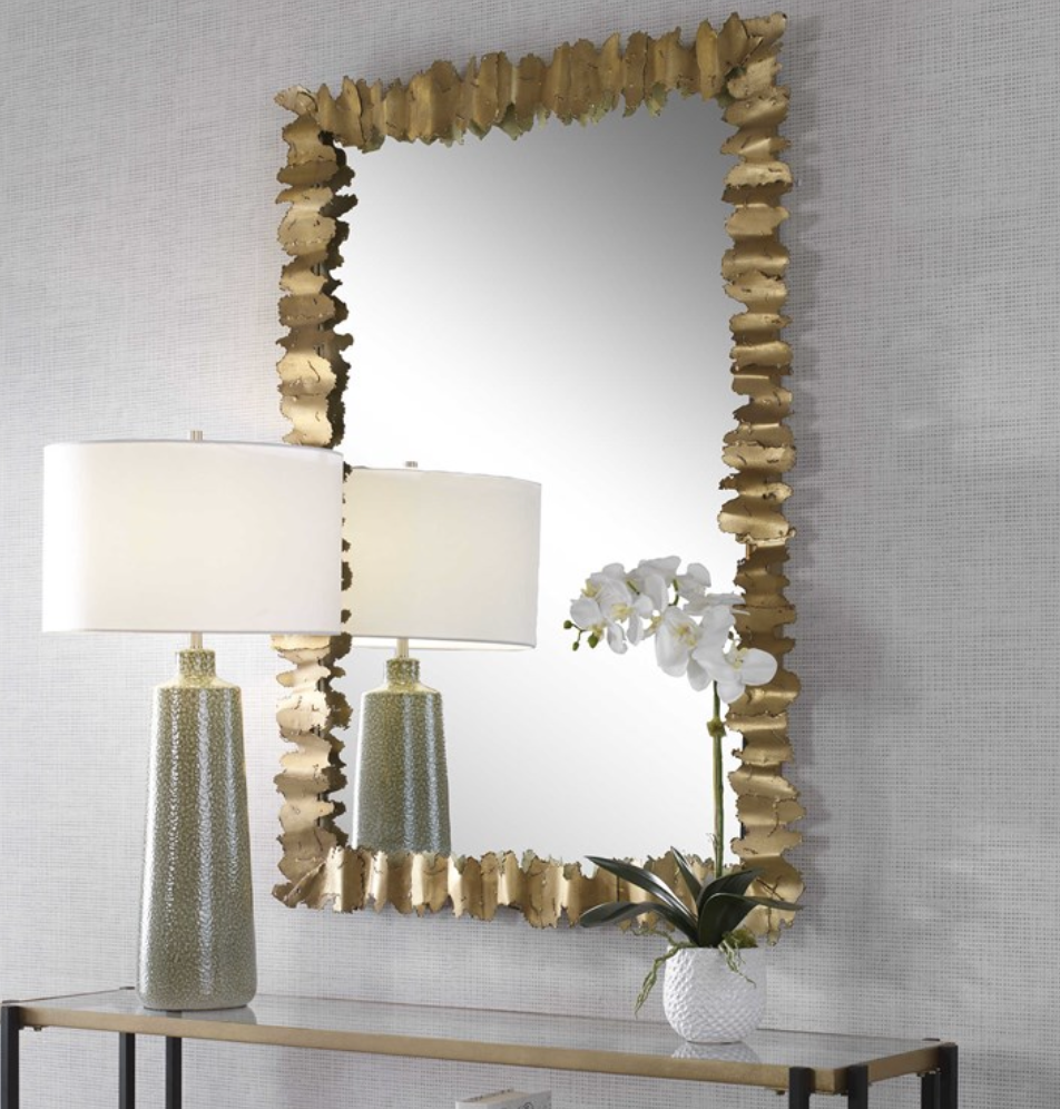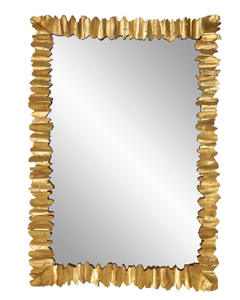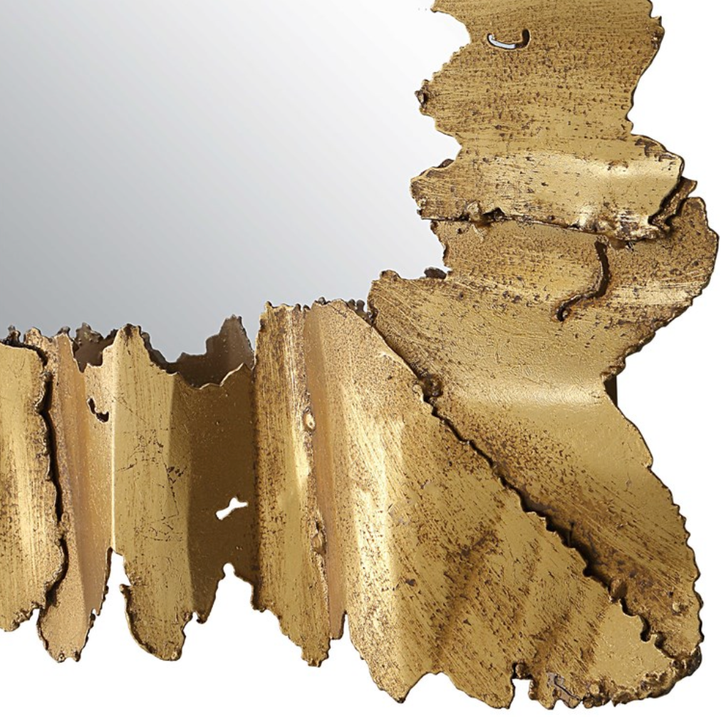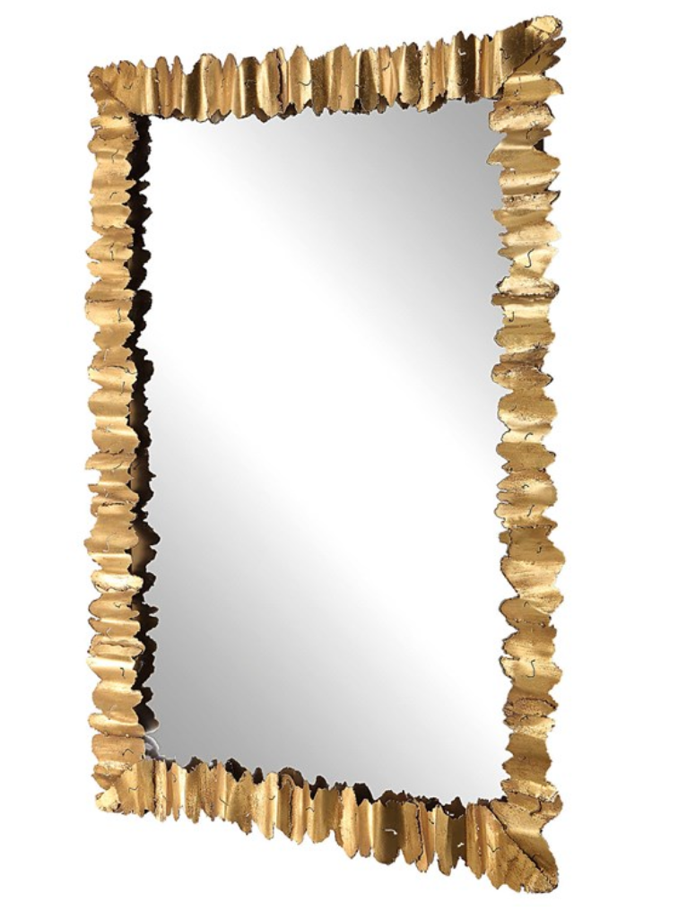 The Lev Mirror showcases crude cut steel pieces finished in antique gold that are layered together to create a contemporary frame with an artful design. May be hung horizontal or vertical.