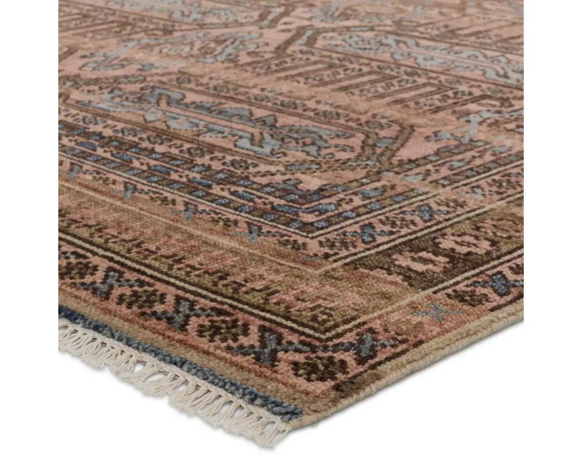 The Liberty collection infuses homes with traditional design and exceptional artisan-made accents. The hand-knotted Leone rug showcases mini-medallions with tribal detailing. Pink, brown, and beige tones ground this durable wool rug, while the blue pattern pops for a global look.