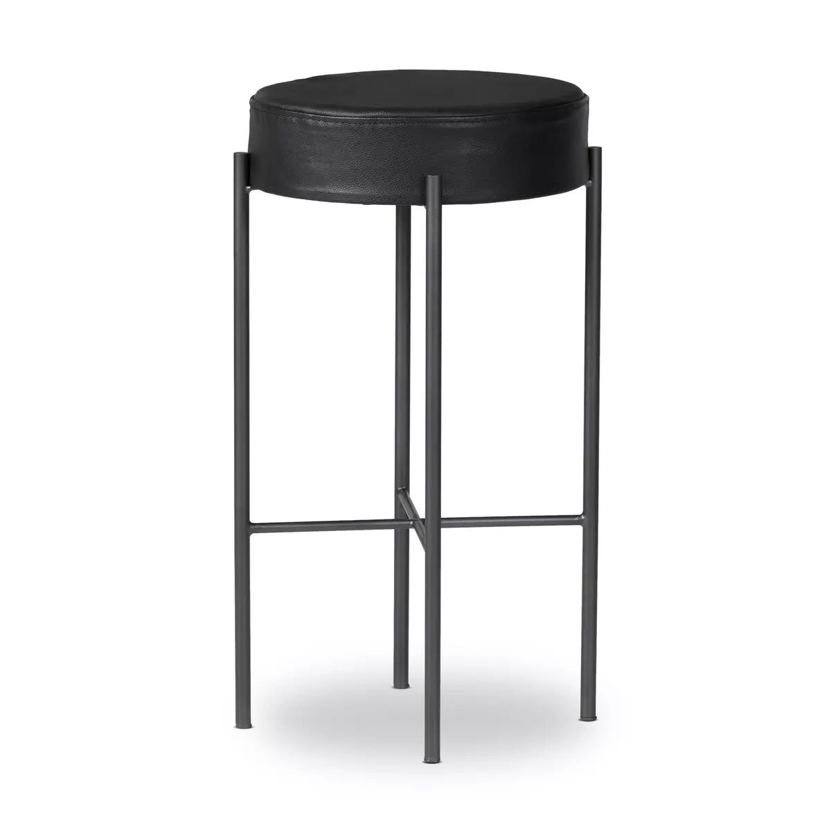 Slim and airy, gunmetal-finished iron legs form a cradle-style frame for speckled hide seating, perfectly sized for the counter. No two hides are the same. A variance in hide color, shape, pattern and hair length is to be expected, reflective of natural materials.