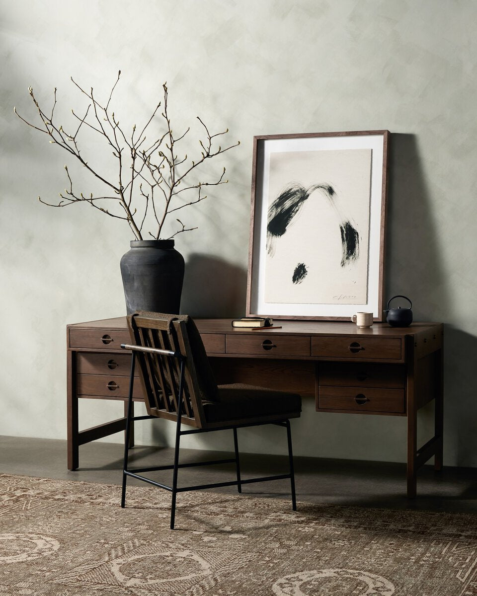 Made from warm-toasted oak, brass-finished bolt covers add an aesthetic element to a storage-driven desk. Eight drawers plus open shelving offer plenty of space for office staples.