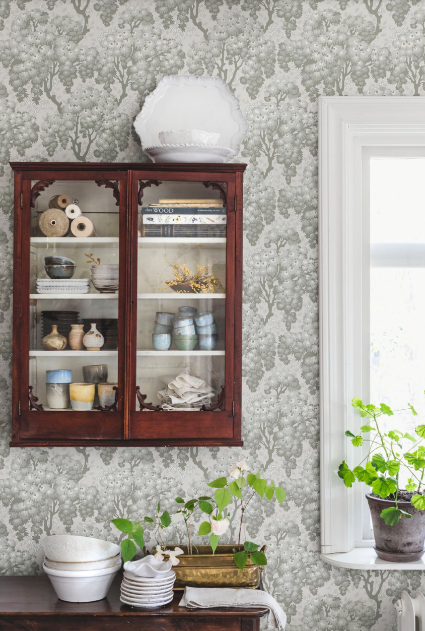 Likened to simply existing within the dancing crowns of the linden trees and their floral bed. This wallpaper from our archives is available in three new colourways. The detailed patterns of foliage and tiny daisies are interwoven to create an uplifting sense of gentle, cloudy skies.