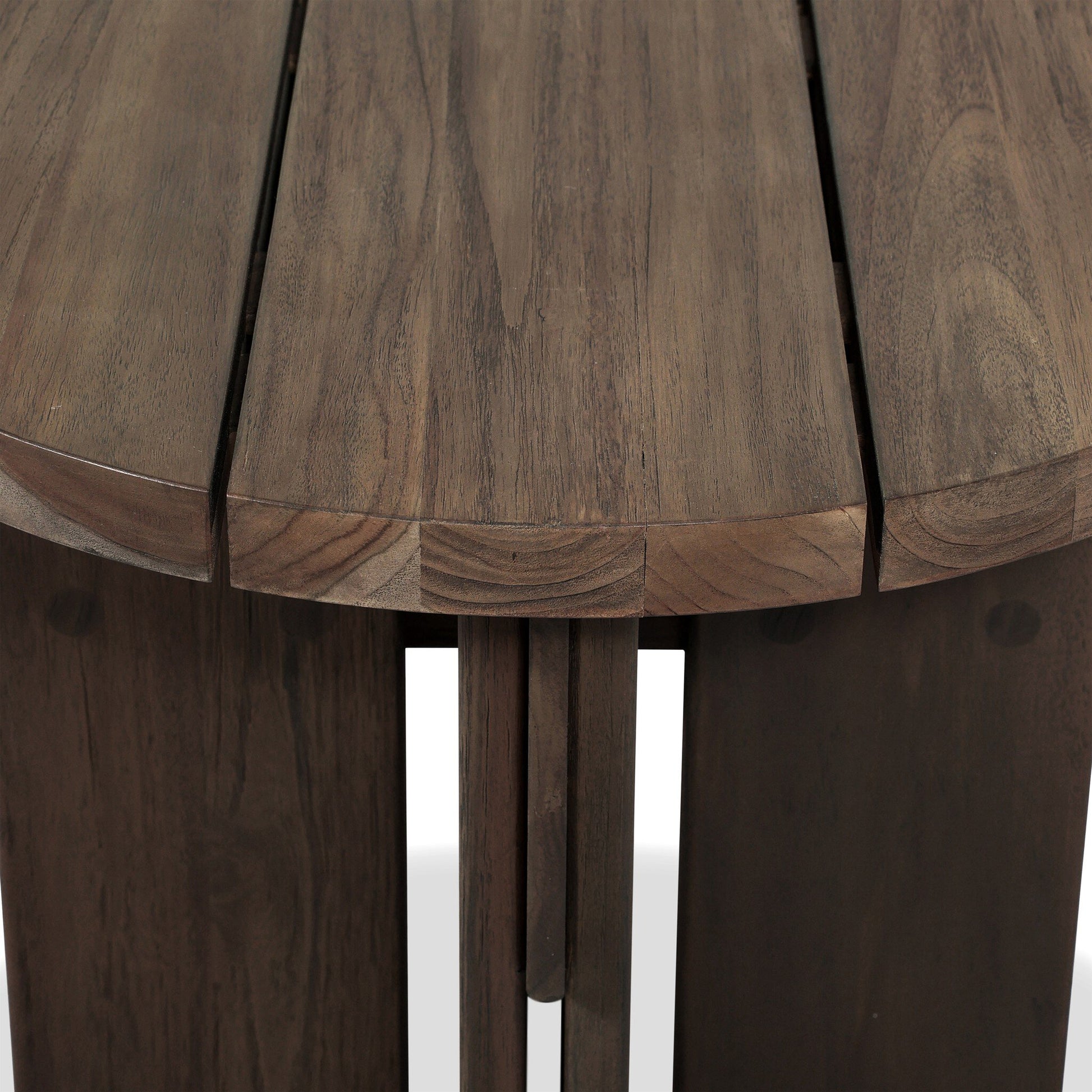 Solid FSC®-certified teak in a stained toasted brown finish with uniquely linear joint and connection details, complemented by cross stretchers running through the center of this outdoor end table. Cover or store inside during inclement weather and when not in use.