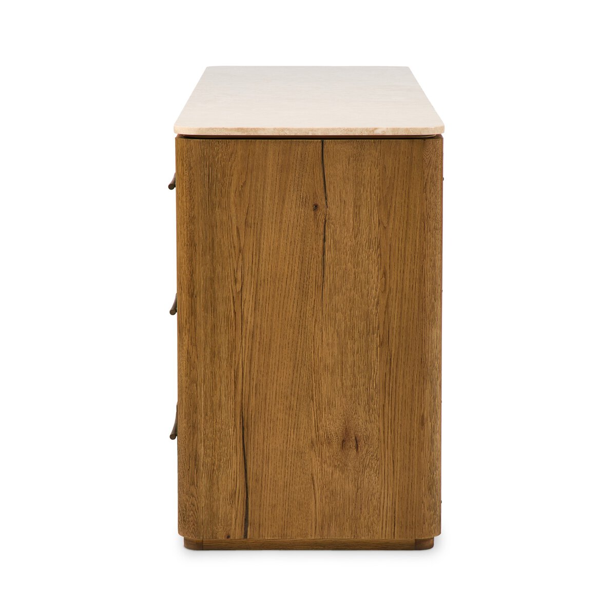 A smooth marble top adds refinement to a clean-lined dresser of worn oak with a plinth base and slate-brushed hardware. Six spacious drawers are finished off with soft-close undermount glides.