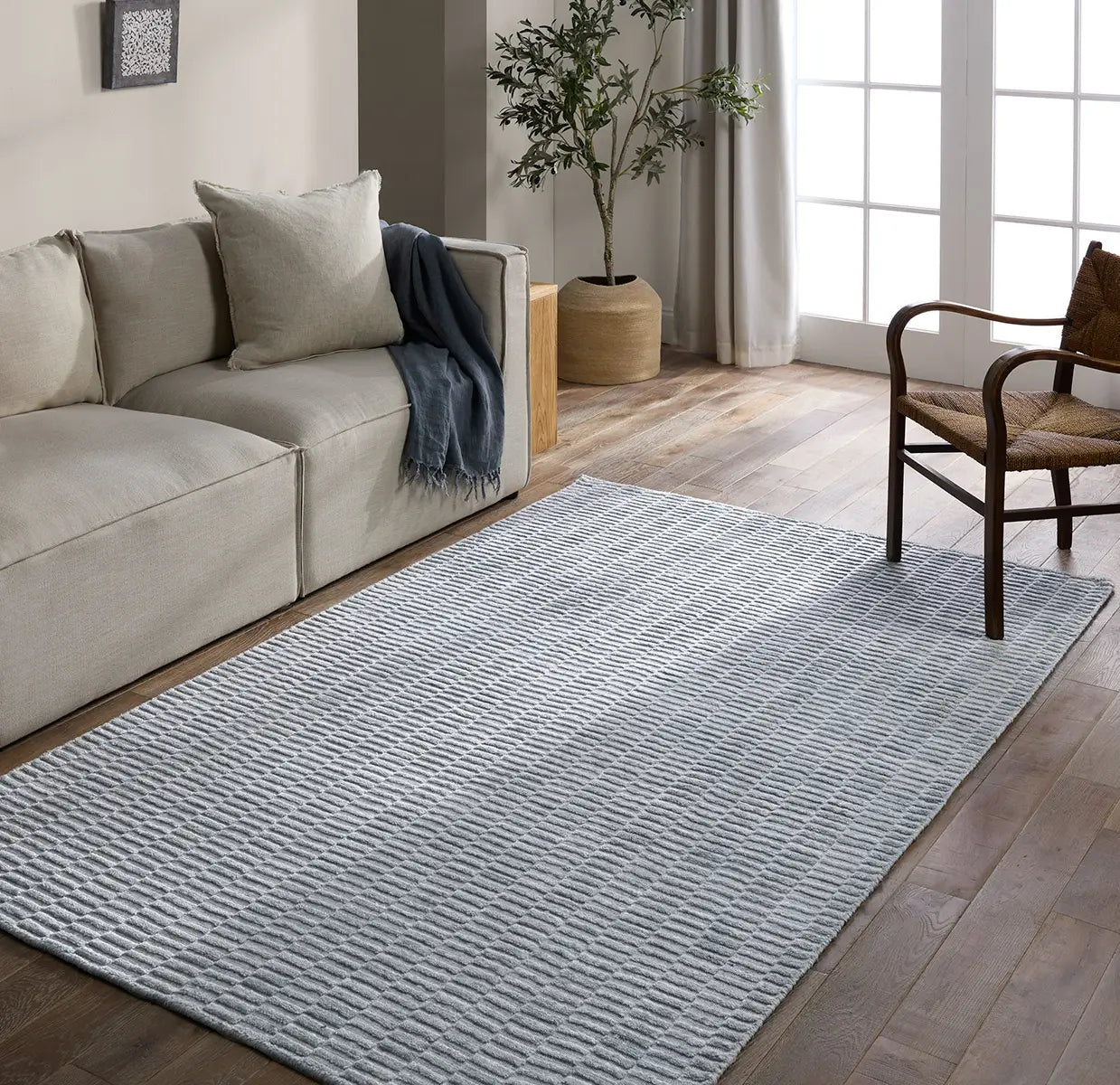 Made from 100% PET the indoor/ outdoor handwoven Roan collection is perfect for performance needs.  This pseudo-solid blue rug bodes a light checkered appearance with a neutral backdrop.