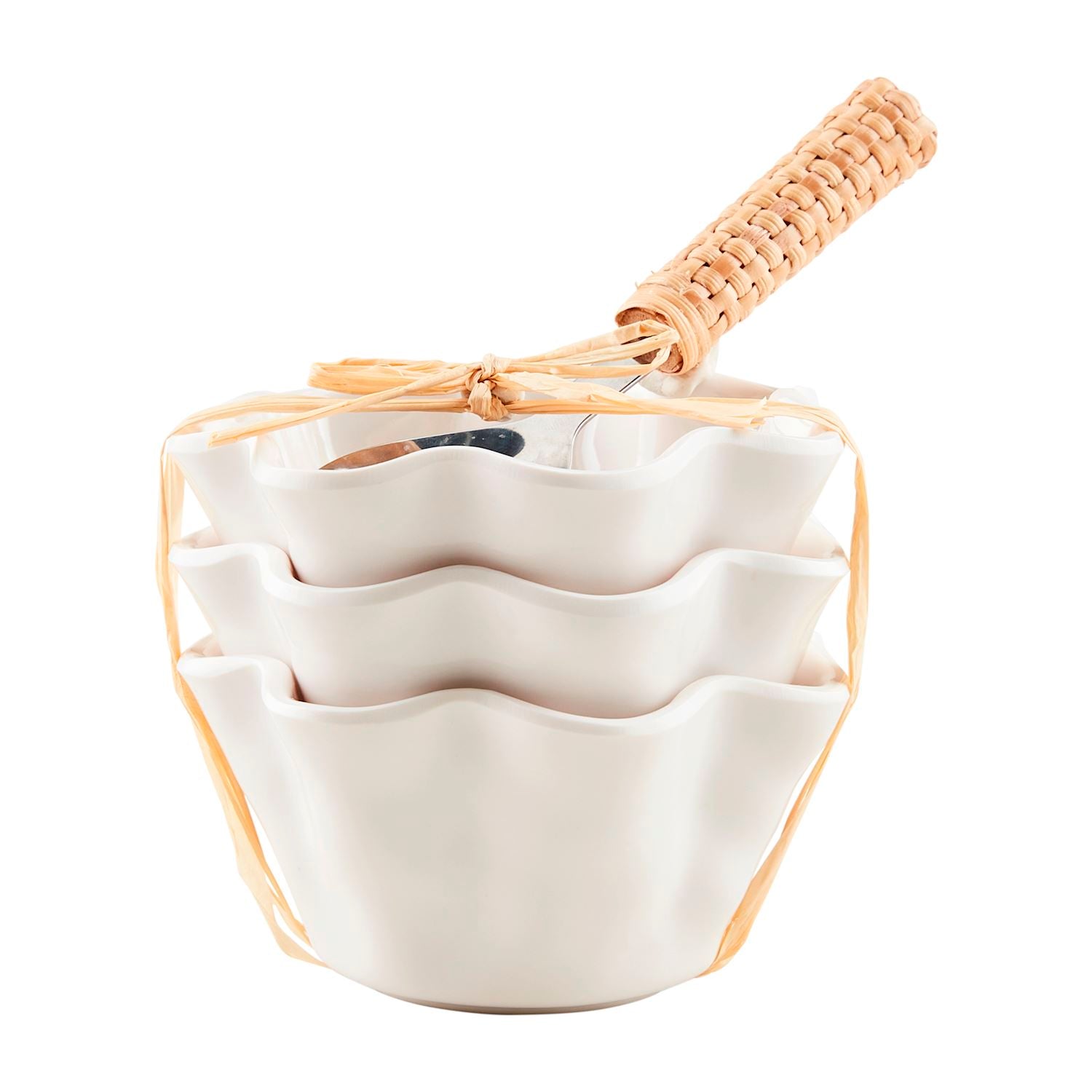 4-piece set. Set of three shatterproof melamine tidbit bowls with ruffle edge detail. Comes with stainless steel spoon with rattan handle.