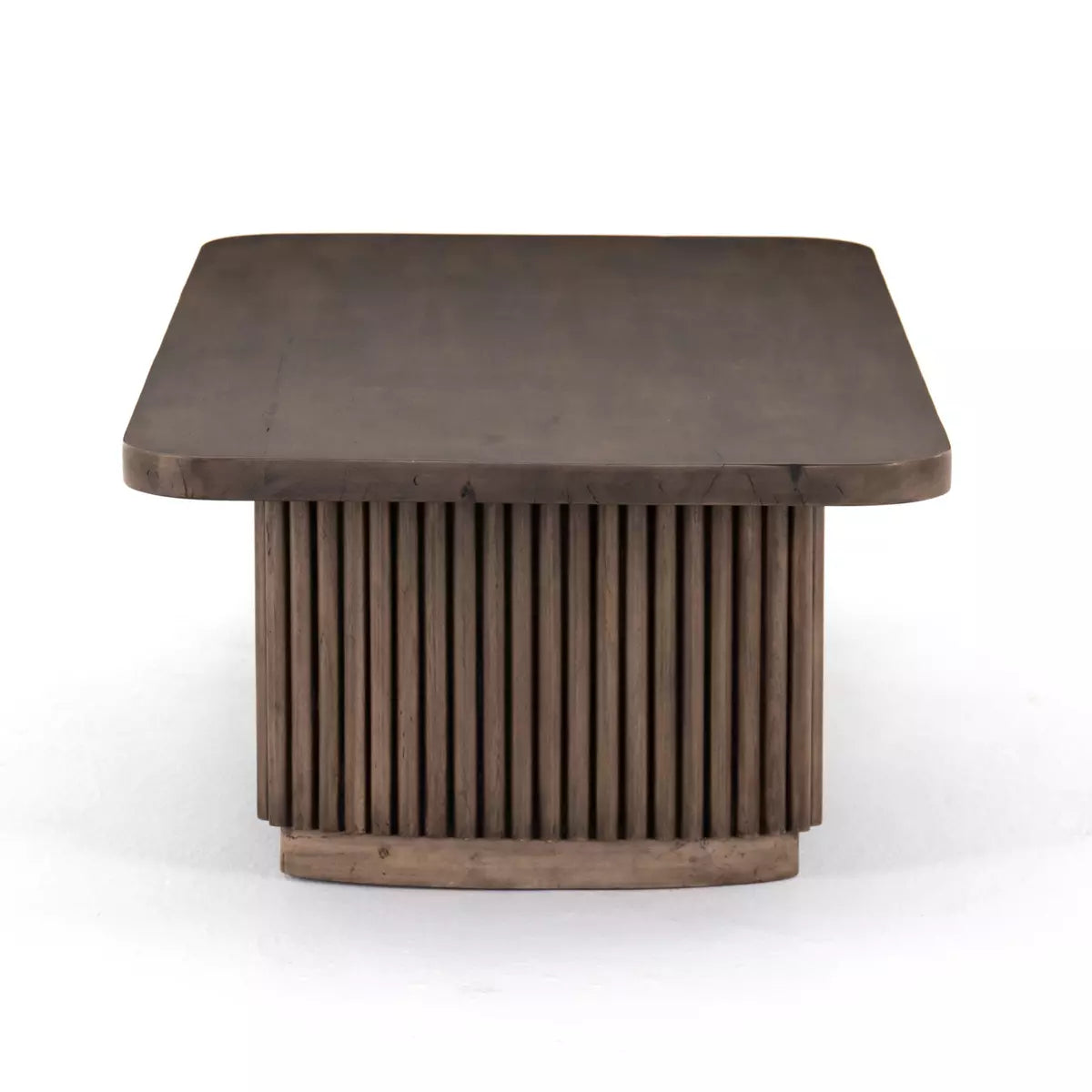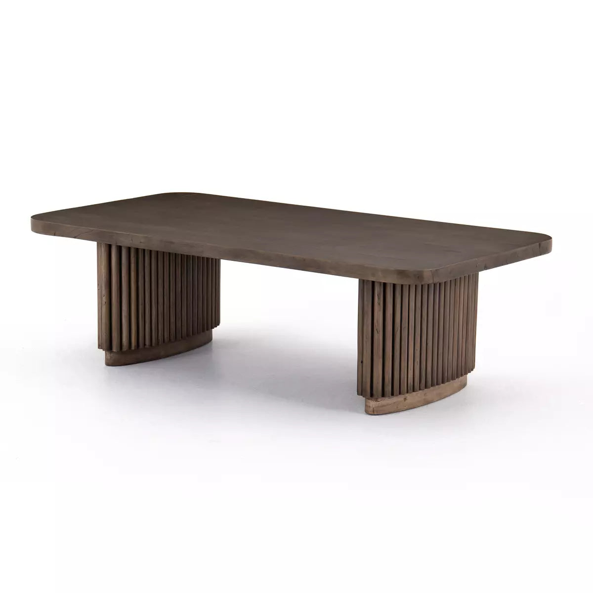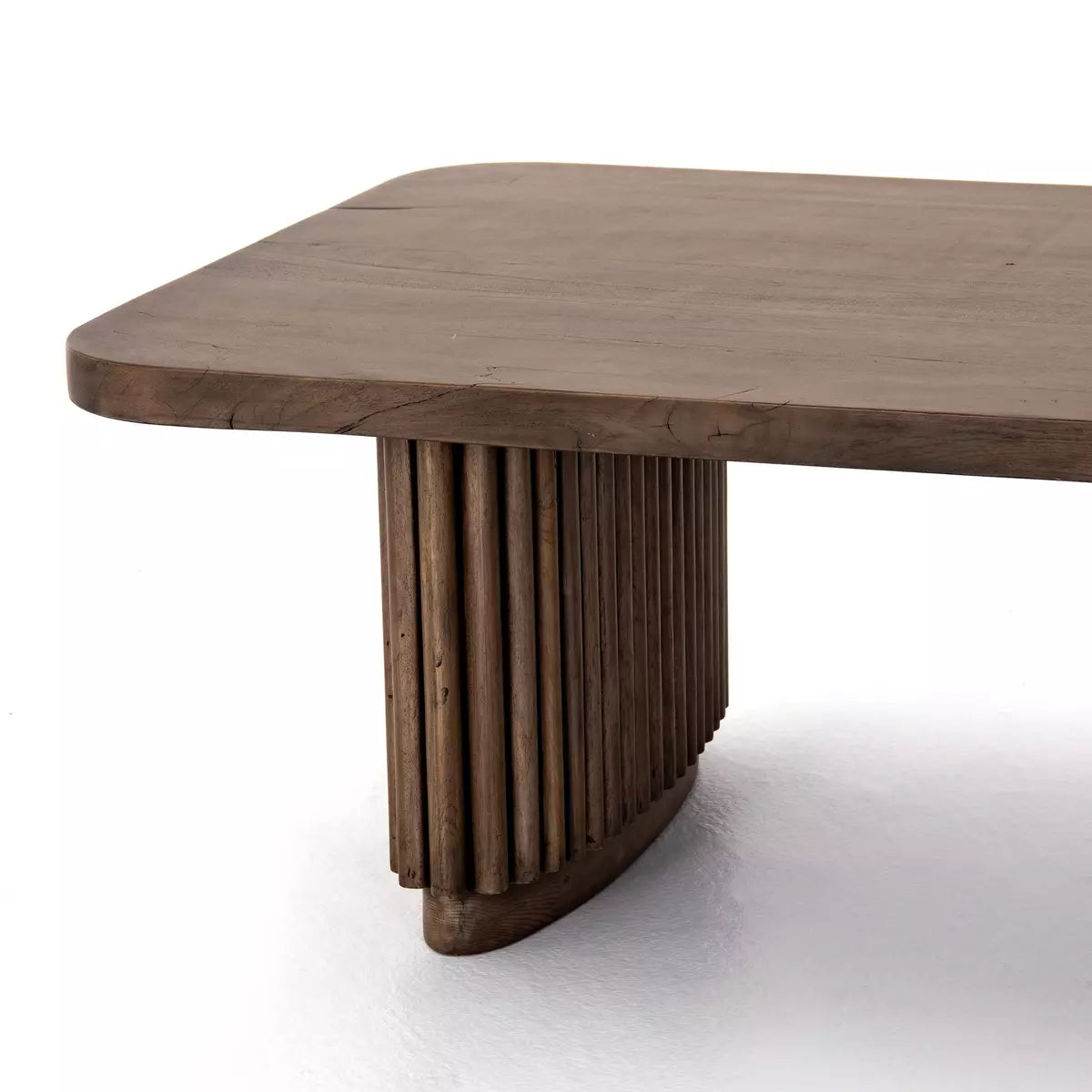 Inspired by décor in the majestic palaces of Jaipur, a conversation-starting coffee table is made from mixed reclaimed woods, with a rounded rectangular top and pedestal legs with vertical reeding atop a sleek plinth base.