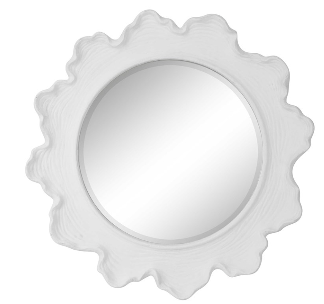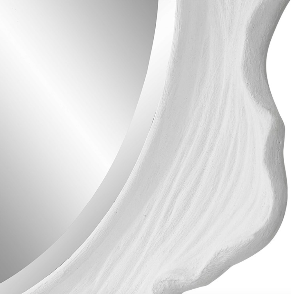Reminiscent of white coral, this round mirror showcases a contemporary coastal design. The organic shaped frame is finished in matte white with noticeable waves and texture.