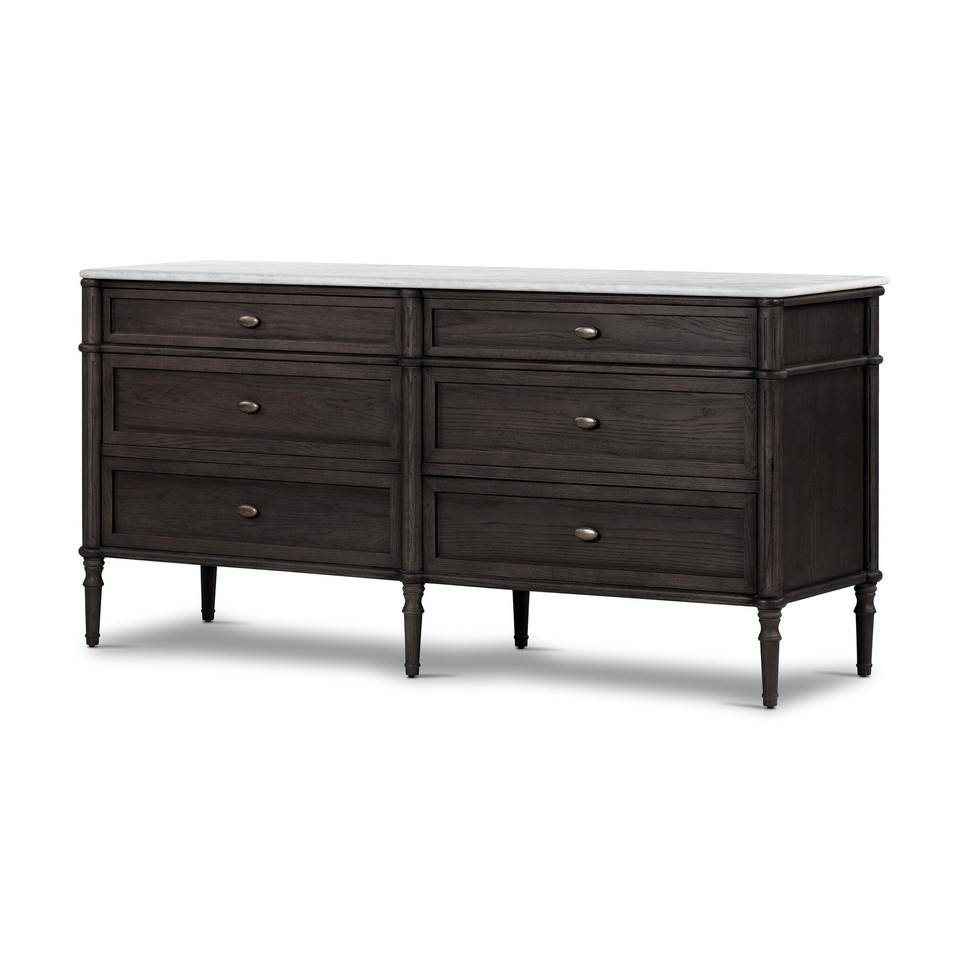 Influenced by vintage European lines, this spacious six-drawer dresser is elegant and full of presence. Framed panels, rounded corners and finished with aged brass drawer pulls and tapered spindle legs for character. Made from solid oak and veneer in distressed black for a classic look.