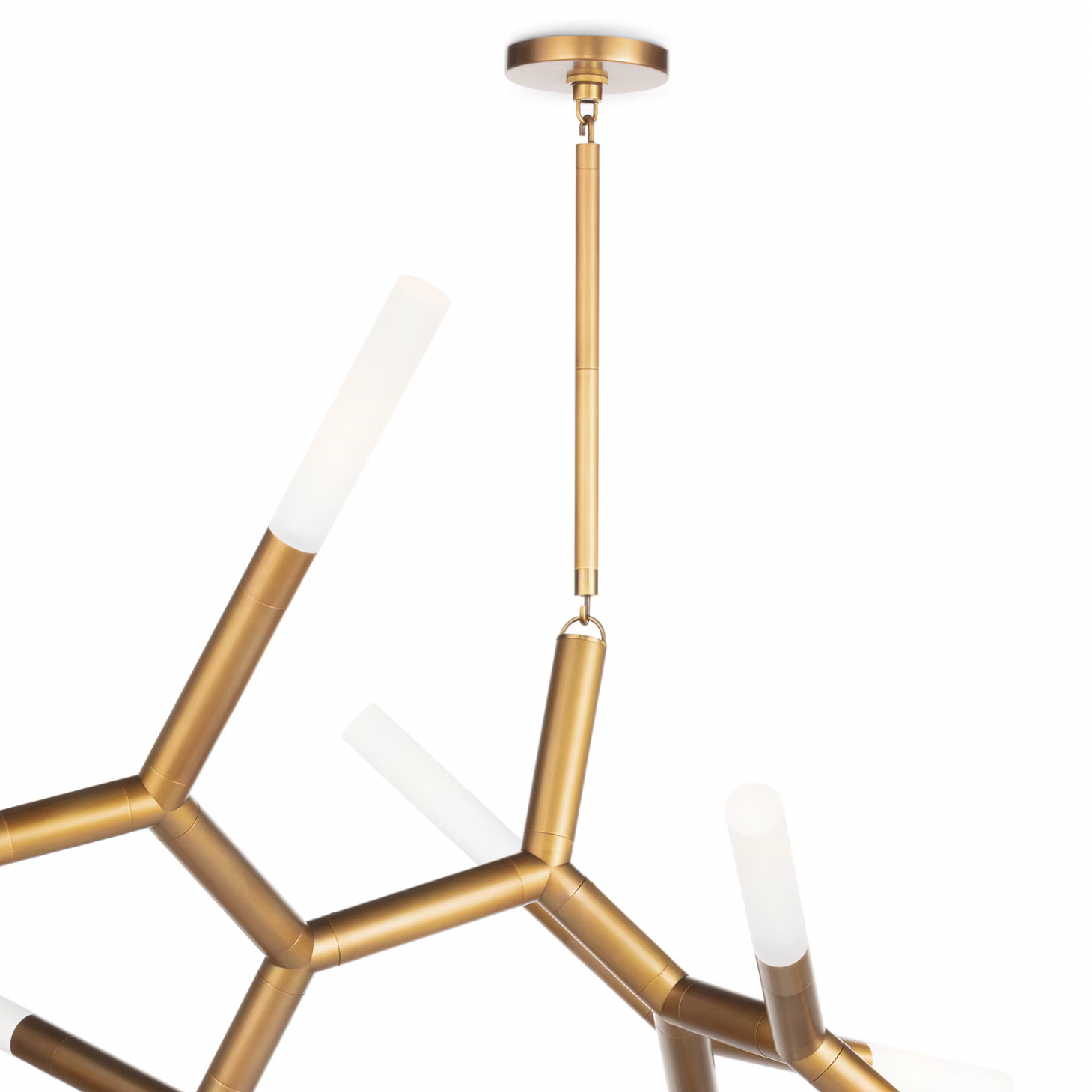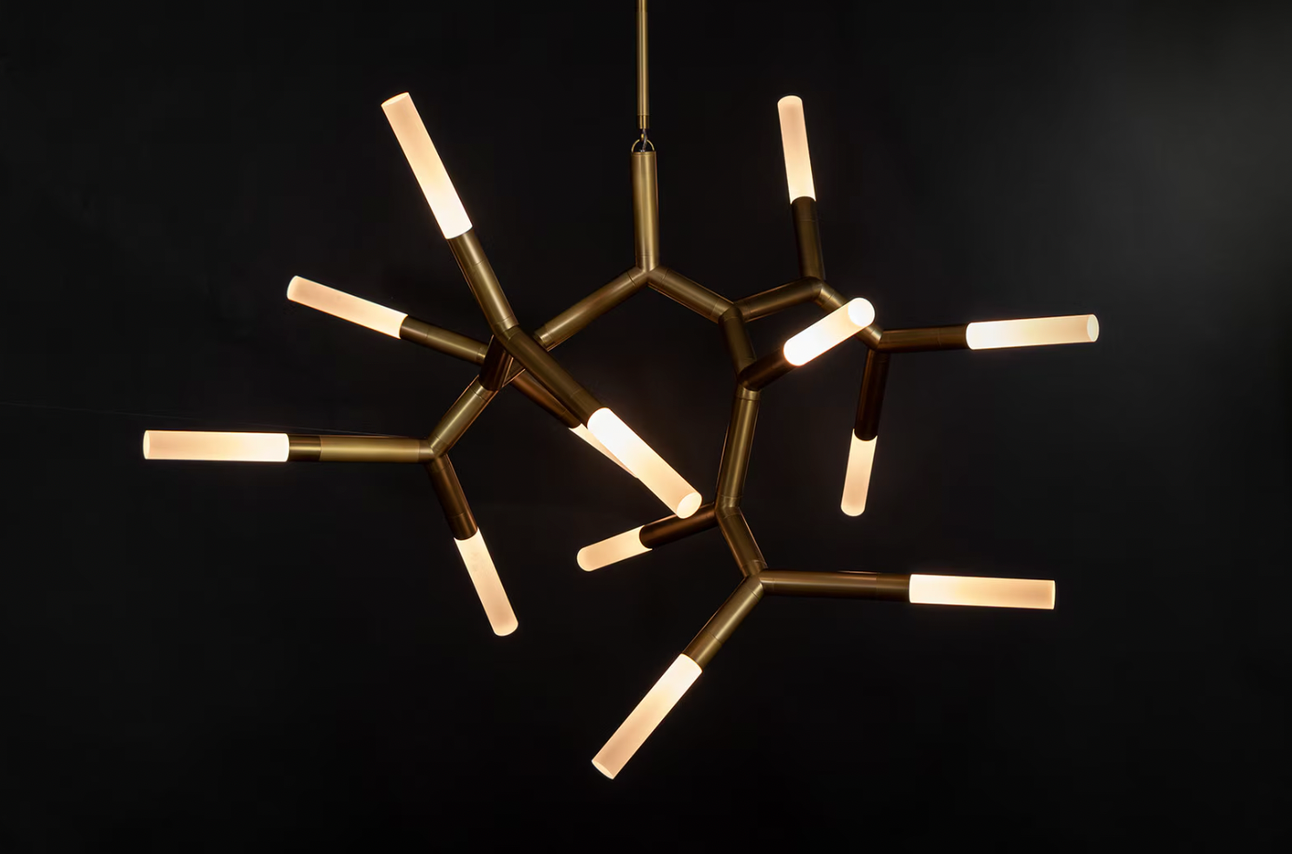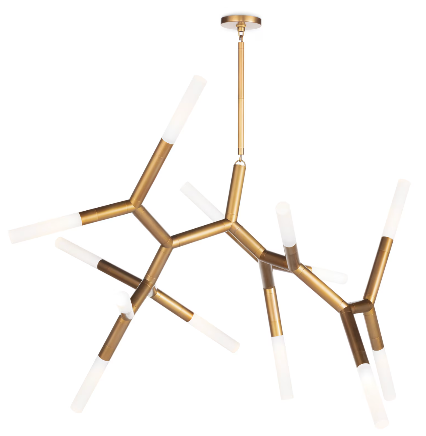 Traveler Chandelier Large is the epitome of modern dynamism with its multiple branching end points finished in custom frosted acrylic bulb covers. Expertly engineered to hang at a slight angle, place this sculptural wonder over a table, in an office, or entryway for a modern lighting statement piece.