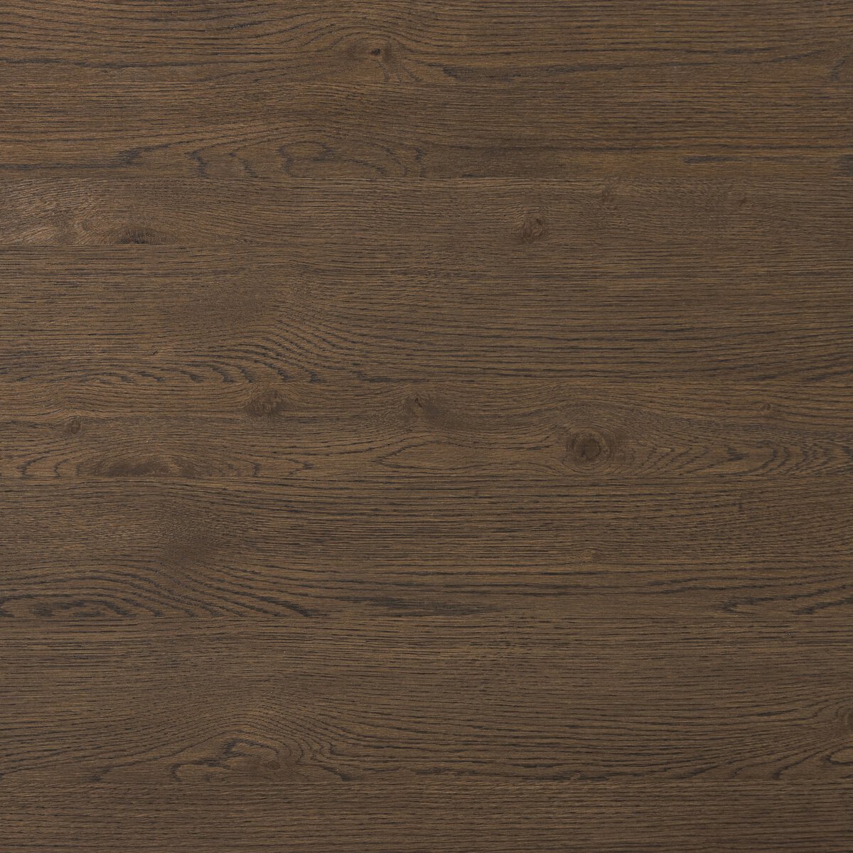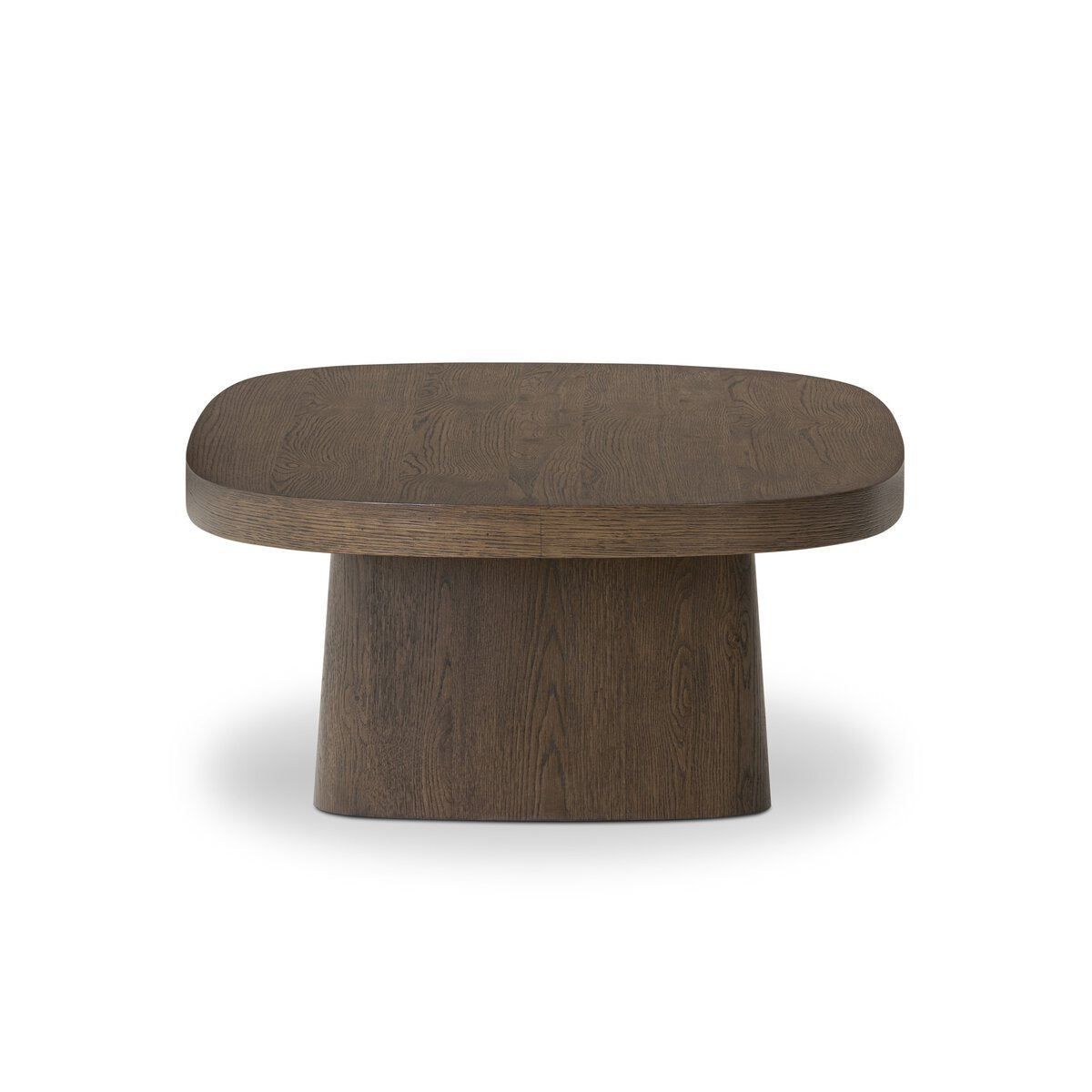 Made from rustic brown oak, a rectangular coffee table is streamlined while not short on presence, with its exaggerated cylinder legs and polished pill-shaped top.