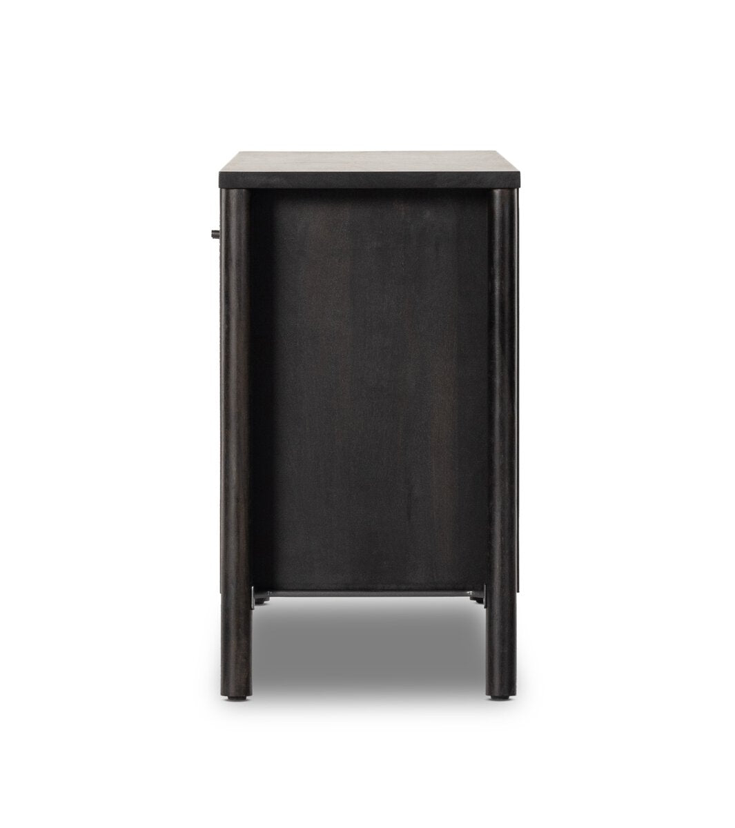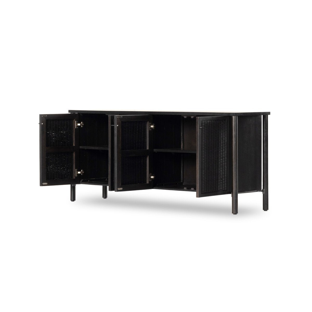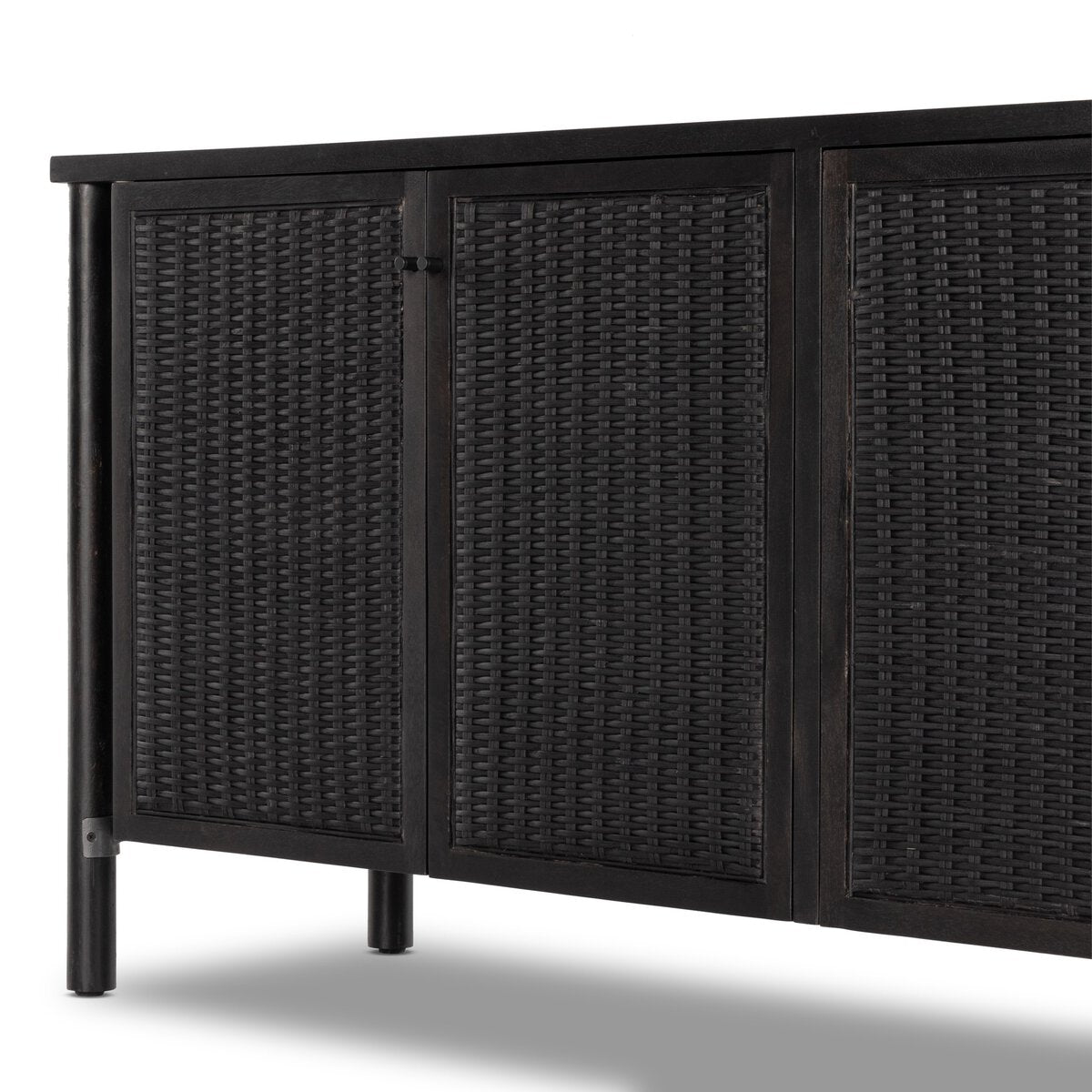 A modern weave pattern refreshes an ever-trending material. Solid mango encases cane door fronts with a black finish and textural basket weave. Dowel legs separate from casing for a float-like look. Spacious interior perfect for storing table linens and serve ware.