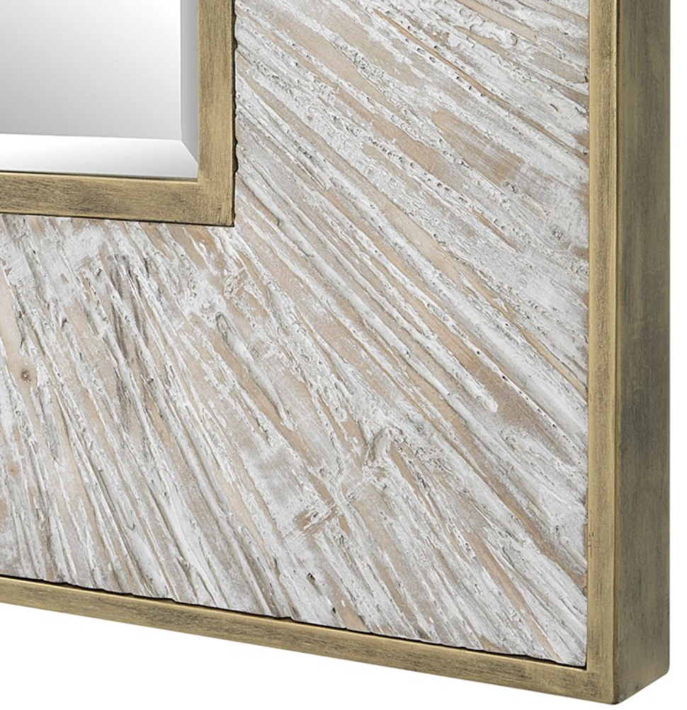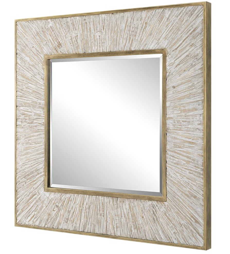 Rustic with a twist, this square mirror is constructed from solid wood in a heavily distressed finish with aged whitewash. Iron details are finished in aged gold. The mirror features a generous 1 1/4" bevel.