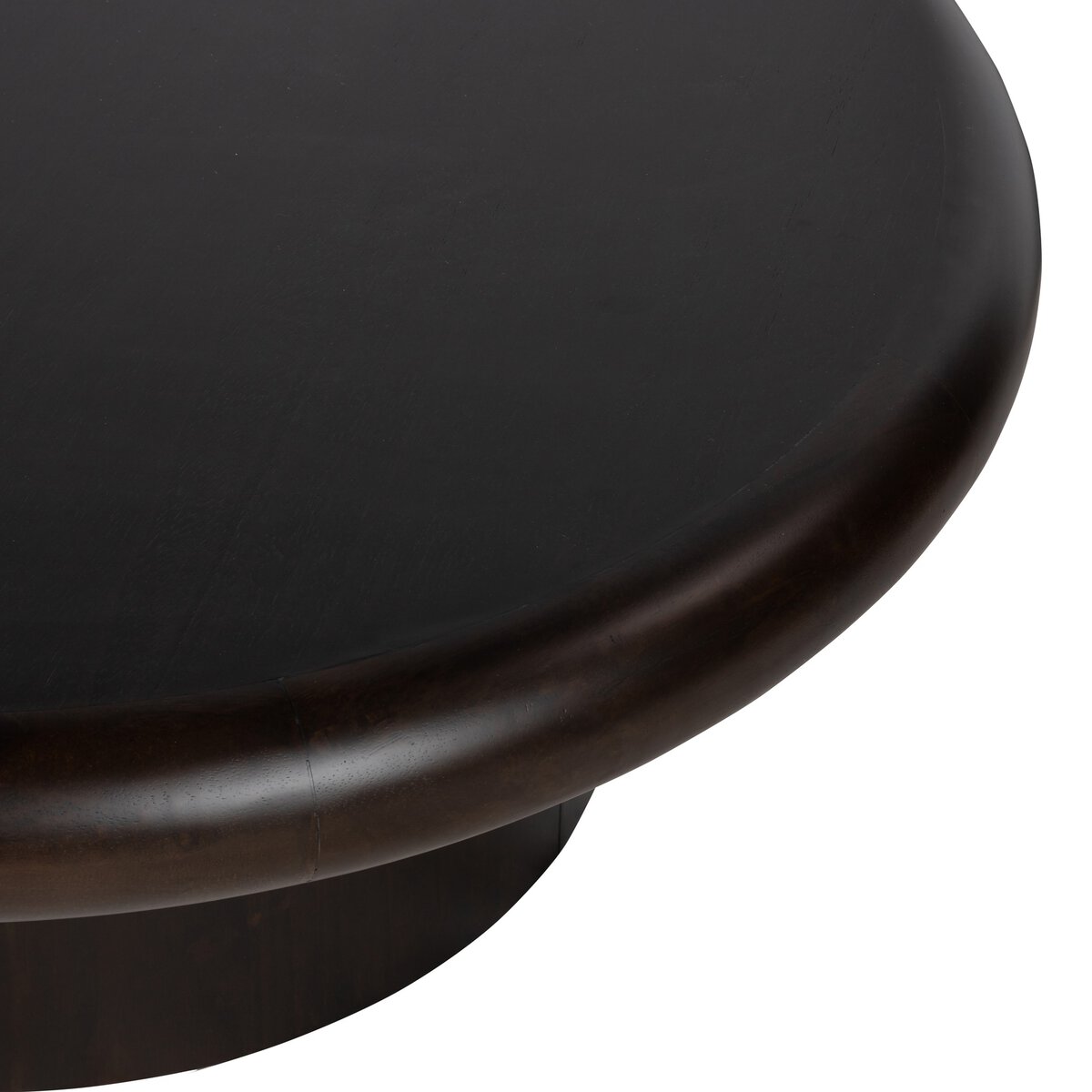 Turn up the volume. A pedestal-style base of solid charcoal parawood supports a rounded tabletop with bullnose edging, for style and softness alike.